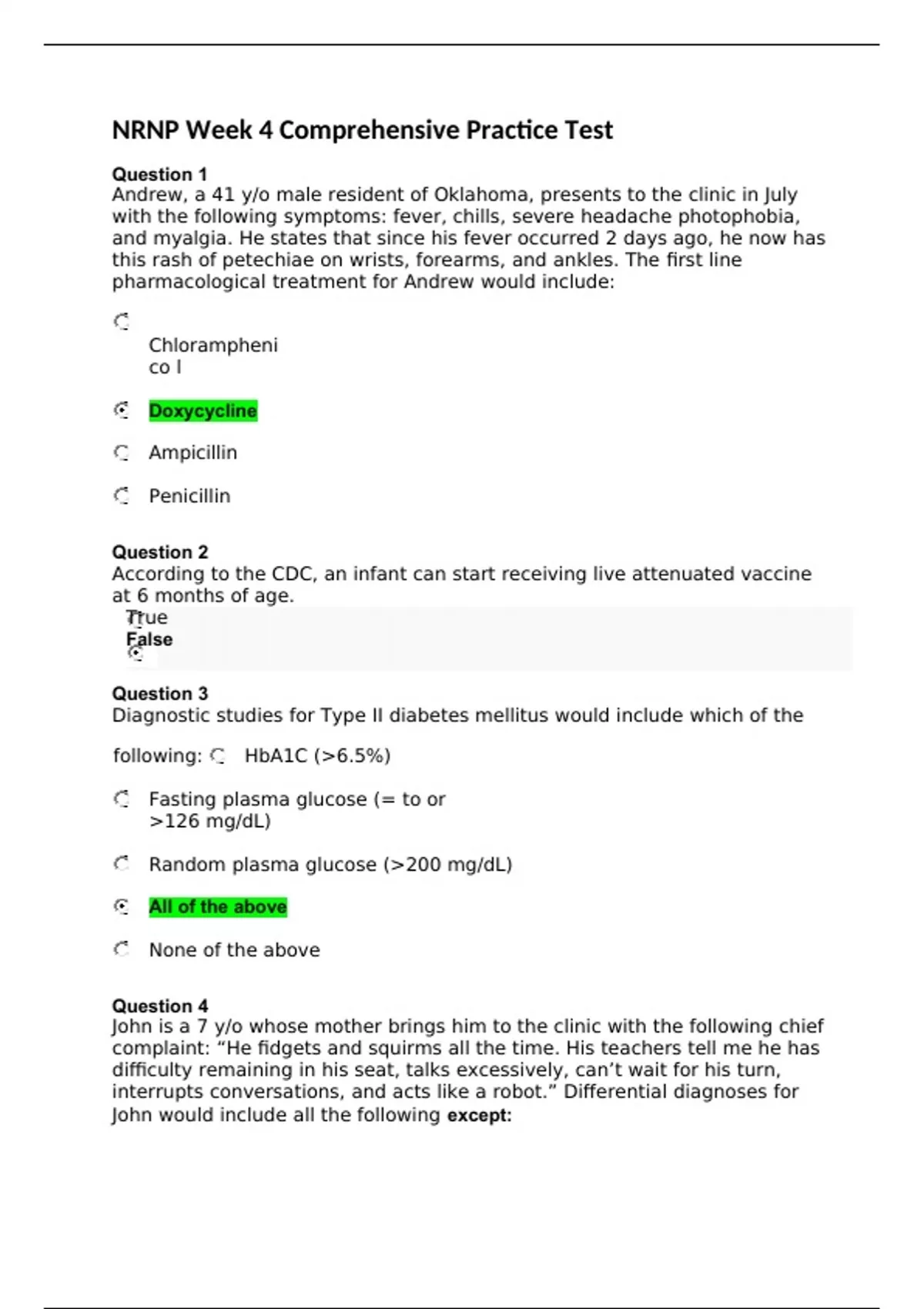 1. Question: Andrew, a 41 y/o male resident of Oklahoma, presents to the clinic in July with the following symptoms: fever, chills, severe headache photophobia, and myalgia. He states that since his fever occurred 2 days ago, he now has this rash of petechiae on wrists, forearms, and ankles. The first line pharmacological treatment for Andrew would include: 2. Question: According to the CDC, an infant can start receiving live attenuated vaccine at 6 months of age. 3. Question: Diagnostic studies for Type II diabetes mellitus would include which of the following: 4. Question: John is a 7 y/o whose mother brings him to the clinic with the following chief complaint: “He fidgets and squirms all the time. His teachers tell me he has difficulty remaining in his seat, talks excessively, can’t wait for his turn, interrupts conversations, and acts like a robot.” Differential diagnoses for John would include all the following except: 5. Question: Sara is a 38 y/o multipara who is in her 6th–7th month of pregnancy with her fourth child. She has a new onset of vaginal bleeding that is worsened by intercourse. On external physical exam, you note that her uterus is soft and non-tender to palpation. The most likely diagnosis for this condition is: 6. Question: Jay is a 72 y/o male who comes to the clinic with the following chief complaint: “I have been feeling very tired recently and having trouble breathing when I go upstairs. I noticed that my ankles and feet are swollen and I have been putting on weight.” Treatment for Jay’s diagnosis could include which of the following? 7. Question: Ann is a primigravida in her 35th week of pregnancy and presents to the clinic with severe recurrent headaches, blurred vision, pitting edema, and right upper quadrant pain. Additionally, she has oliguria, nausea, and vomiting. Her urine protein is 1+. Her most likely diagnosis is: 8. Question: The CDC recommends that after a child receives a vaccine (s)he should be monitored for: 9. Question: Marty is an 18 y/o outdoorsman who loves hiking in the woods. Marty notes that he was hiking about 10 days ago, and now he has a red rash with a central clearing that looks like a target. The rash is rough and hot to the touch. He now has flu-like symptoms. The NP diagnoses this rash as: 10. Question: Sara is a 38 y/o multipara who is in her 6th–7th month of pregnancy with her fourth child. She has a new onset of vaginal bleeding that is worsened by intercourse. On external physical exam, you note that her uterus is soft and non-tender to palpation. Knowing that her cervix is not dilated, the most appropriate treatment would be: 11. Question: Jay is a 72 y/o male who comes to the clinic with the following chief complaint: “I have been feeling very tired recently and having trouble breathing when I go upstairs. I noticed that my ankles and feet are swollen and I have been putting on weight.” The most likely diagnosis for this patient is: 12. Question: Jane is a 57 y/o female whose husband of 35 years just passed away in the past 6 months. Jane comes to the clinic and says: “I cry all the time. I can’t sleep, I have no energy, I have lost 20 pounds in the past 2 months, and I get easily agitated. What’s wrong with me?” 13. Question: Maria is a 26 y/o female in her third trimester of pregnancy. She has a sudden onset of vaginal bleeding and has a hypertonic uterus. She has a history of hypertension secondary to previous cocaine use. Her most likely diagnosis would be: 14. Question: Sara is a 38 y/o multipara who is in her 6th–7th month of pregnancy with her fourth child. She has a new onset of vaginal bleeding that is worsened by intercourse. On external physical exam, you note that her uterus is soft and non-tender to palpation. If Sara started having uterine cramping, then the most appropriate immediate treatment would be: 15. Question: Which vaccine is required at birth of a newborn? 16. Question: Bonnie is a 76 y/o female patient who resides in a nursing home. She is currently on a 10-day course of Clindamycin for a recurrent bacterial vaginal infection. She has started having 10–15 watery stools per day. The NP recognizes this as: 17. Question: Mark is an alcoholic who is stopped for drunk driving. When the officers approach him he states that he wants to die. The officers decide that for his own protection they will Baker Act him. The Baker Act allows for involuntary detention for what period. 18. Question: Cellulitis is usually caused by a gram-negative bacterium. 19. Question: Bobby is a 20 y/o African American male who comes to the clinic with the following presentation. His BMI is 85% for his age and sex. His PMH indicates hypertension, hyperlipidemia, and acanthosis nigricans. Based on his PMH and presenting symptoms, the NP would most likely be inclined to identify him as having: 20. Question: John is a 7 y/o whose mother brings him to the clinic with the following chief complaint: “He fidgets and squirms all the time. His teachers tell me he has difficulty remaining in his seat, talks excessively, can’t wait for his turn, interrupts conversations, and acts like a robot.” After evaluation, the NP determines that he probably has which of the following: 21. Question: Martin is a 17 y/o male who comes to the clinic with the following chief complaint: “I have pain around my belly button and have had no appetite for the past 24 hours. I have had some nausea and have vomited three times. I have had a low-grade fever also.” During the clinical exam, the NP notices that Martin has some guarding and rebound tenderness in the RLQ. In the physical exam, the NP performs some “abdominal” maneuvers. What would be the most appropriate maneuvers for Martin’s symptomatology? 22. Question: Michael is 2 months old and his mother brings him to the clinic for his 2-month vaccinations. Which is the correct combination of vaccines that he needs? 23. Question: Dylan is a 22 y/o Type 1 diabetic. He