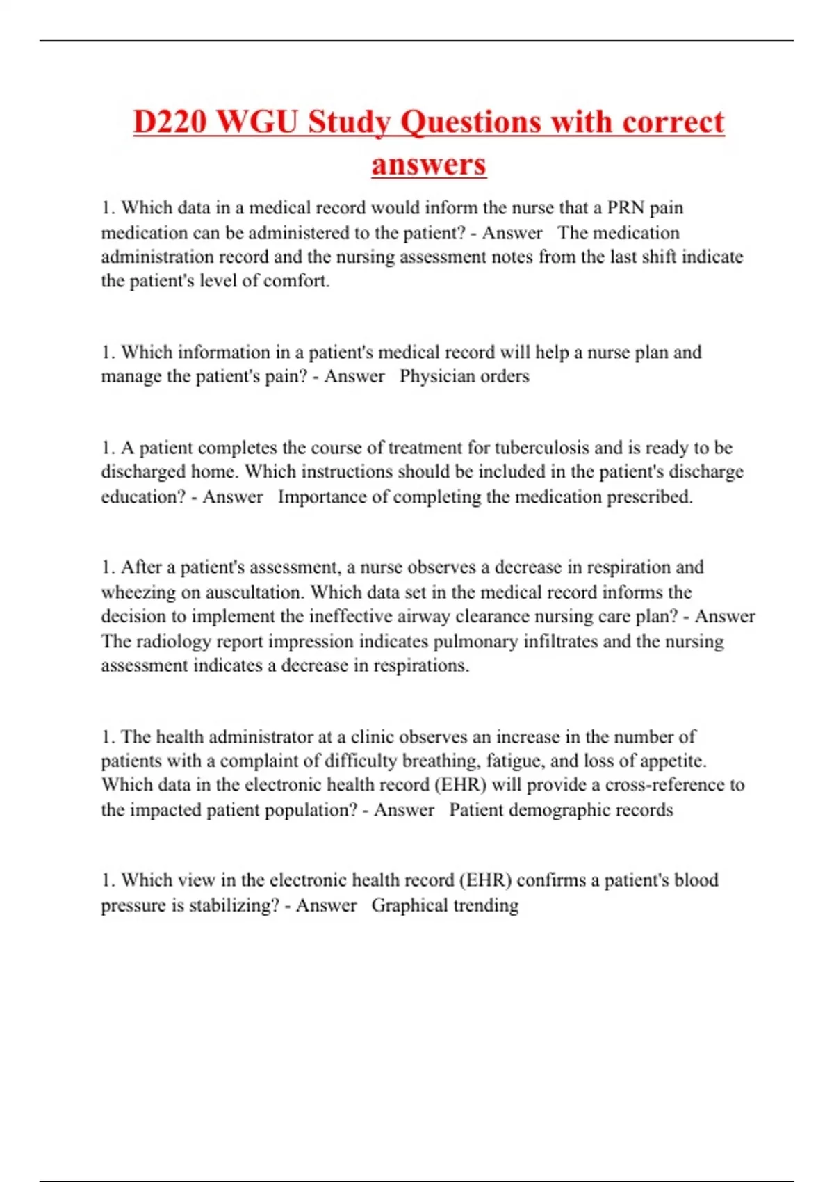 1. Which data in a medical record would inform the nurse that a PRN pain medication can be administered to the patient? - Answer The medication administration record and the nursing assessment notes from the last shift indicate the patient's level of comfort. 1. Which information in a patient's medical record will help a nurse plan and manage the patient's pain? - Answer Physician orders 1. A patient completes the course of treatment for tuberculosis and is ready to be discharged home. Which instructions should be included in the patient's discharge education? - Answer Importance of completing the medication prescribed. 1. After a patient's assessment, a nurse observes a decrease in respiration and wheezing on auscultation. Which data set in the medical record informs the decision to implement the ineffective airway clearance nursing care plan? - Answer The radiology report impression indicates pulmonary infiltrates and the nursing assessment indicates a decrease in respirations. 1. The health administrator at a clinic observes an increase in the number of patients with a complaint of difficulty breathing, fatigue, and loss of appetite. Which data in the electronic health record (EHR) will provide a cross-reference to the impacted patient population? - Answer Patient demographic records 1. Which view in the electronic health record (EHR) confirms a patient's blood pressure is stabilizing? - Answer Graphical trending