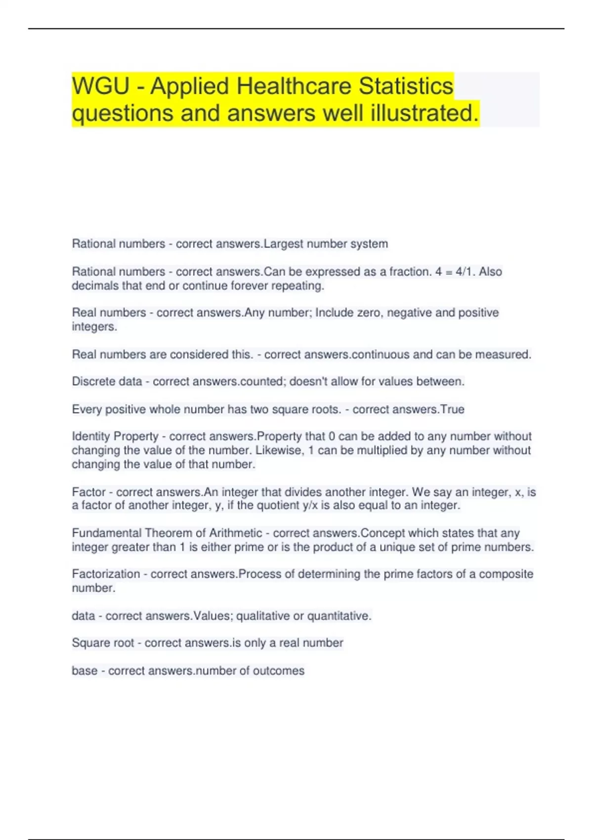 WGU - Applied Healthcare Statistics questions and answers well illustrated. Rational numbers - correct answers.Largest number system Rational numbers - correct answers.Can be expressed as a fraction. 4 = 4/1. Also decimals that end or continue forever repeating. Real numbers - correct answers.Any number; Include zero, negative and positive integers. Real numbers are considered this. - correct nuous and can be measured. Discrete data - correct ed; doesn't allow for values between. Every positive whole number has two square roots. - correct answers.True Identity Property - correct answers.Property that 0 can be added to any number without changing the value of the number. Likewise, 1 can be multiplied by any number without changing the value of that number. Factor - correct answers.An integer that divides another integer. We say an integer, x, is a factor of another integer, y, if the quotient y/x is also equal to an integer. Fundamental Theorem of Arithmetic - correct answers.Concept which states that any integer greater than 1 is either prime or is the product of a unique set of prime numbers. Factorization - correct answers.Process of determining the prime factors of a composite number. data - correct answers.Values; qualitative or quantitative. Square root - correct only a real number base - correct r of outcomes