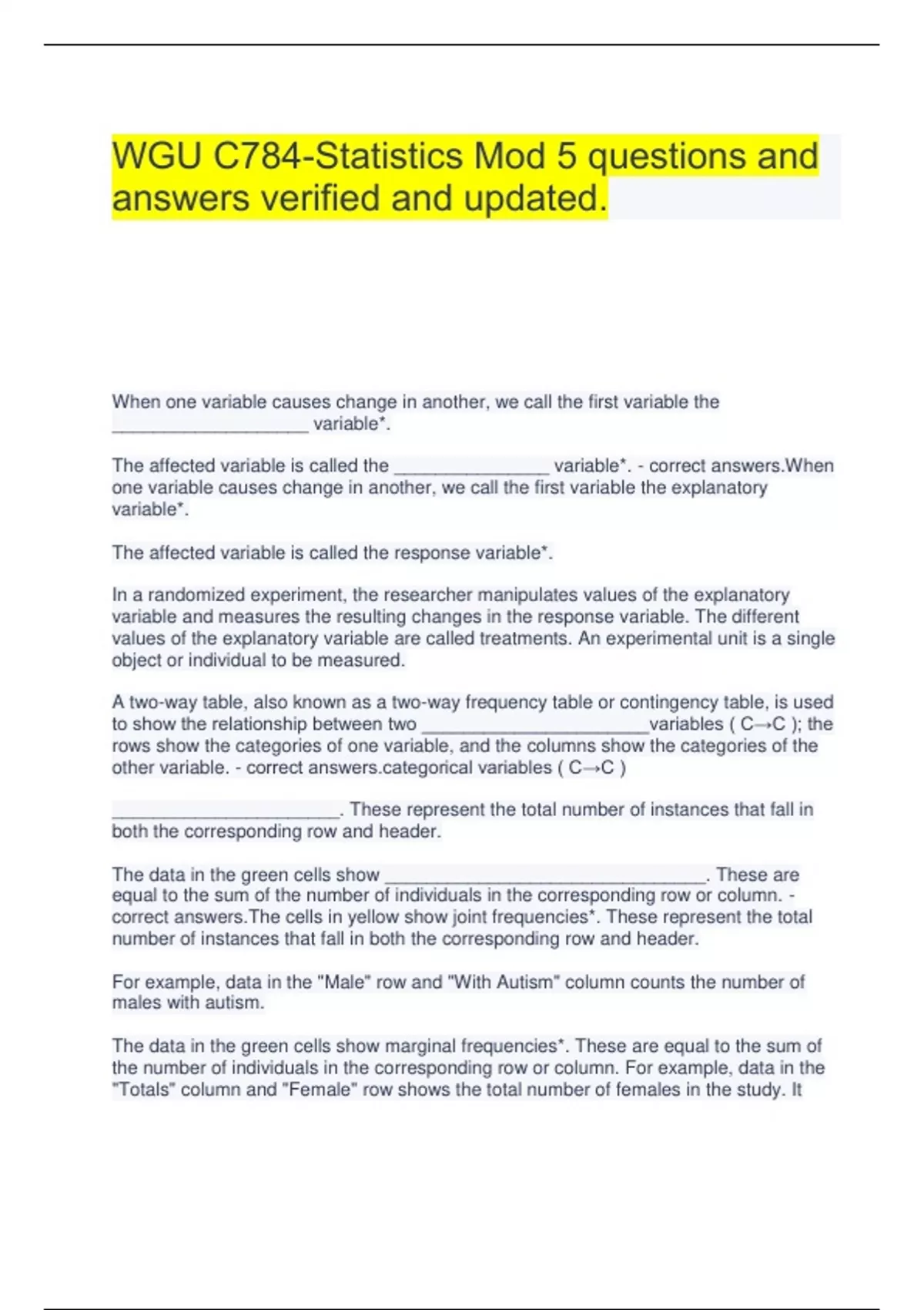 WGU C784-Statistics Mod 5 questions and answers verified and updated. When one variable causes change in another, we call the first variable the ___________________ variable*. The affected variable is called the _______________ variable*. - correct answers.When one variable causes change in another, we call the first variable the explanatory variable*. The affected variable is called the response variable*. In a randomized experiment, the researcher manipulates values of the explanatory variable and measures the resulting changes in the response variable. The different values of the explanatory variable are called treatments. An experimental unit is a single object or individual to be measured. A two-way table, also known as a two-way frequency table or contingency table, is used to show the relationship between two ______________________variables ( C→C ); the rows show the categories of one variable, and the columns show the categories of the other variable. - correct orical variables ( C→C ) ______________________. These represent the total number of instances that fall in both the corresponding row and header. The data in the green cells show _______________________________. These are equal to the sum of the number of individuals in the corresponding row or column. - correct answers.The cells in yellow show joint frequencies*. These represent the total number of instances that fall in both the corresponding row and header. For example, data in the "Male" row and "With Autism" column counts the number of males with autism. The data in the green cells show marginal frequencies*. These are equal to the sum of the number of individuals in the corresponding row or column. For example, data in the "Totals" column and "Female" row shows the total number of females in the study. It
