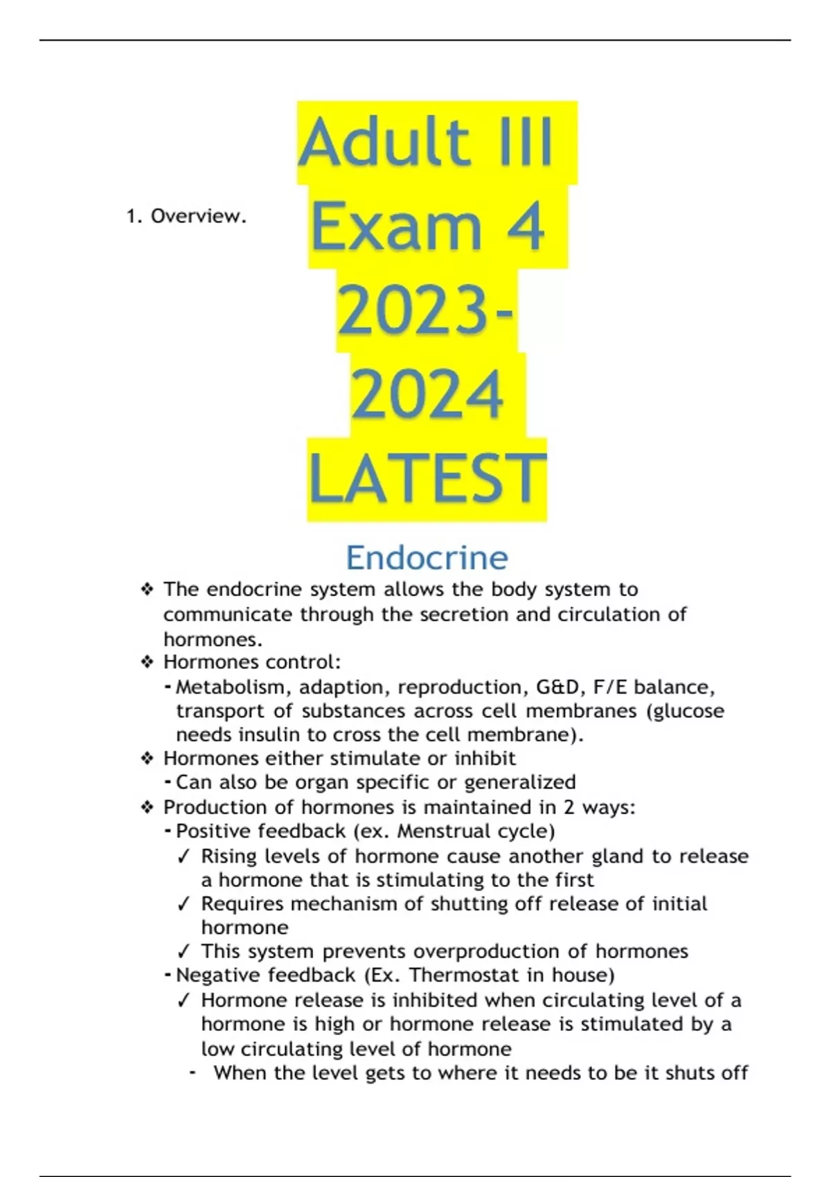 Adult III Exam LATEST Endocrine The endocrine system allows the body system to communicate through the secretion and circulation of hormones. Hormones control: ▪ Metabolism, adaption, reproduction, G&D, F/E balance, transport of substances across cell membranes (glucose needs insulin to cross the cell membrane). Hormones either stimulate or inhibit ▪ Can also be organ specific or generalized Production of hormones is maintained in 2 ways: ▪ Positive feedback (ex. Menstrual cycle) Rising levels of hormone cause another gland to release a hormone that is stimulating to the first Requires mechanism of shutting off release of initial hormone This system prevents overproduction of hormones ▪ Negative feedback (Ex. Thermostat in house) Hormone release is inhibited when circulating level of a hormone is high or hormone release is stimulated by a low circulating level of hormone • When the level gets to where it needs to be it shuts off