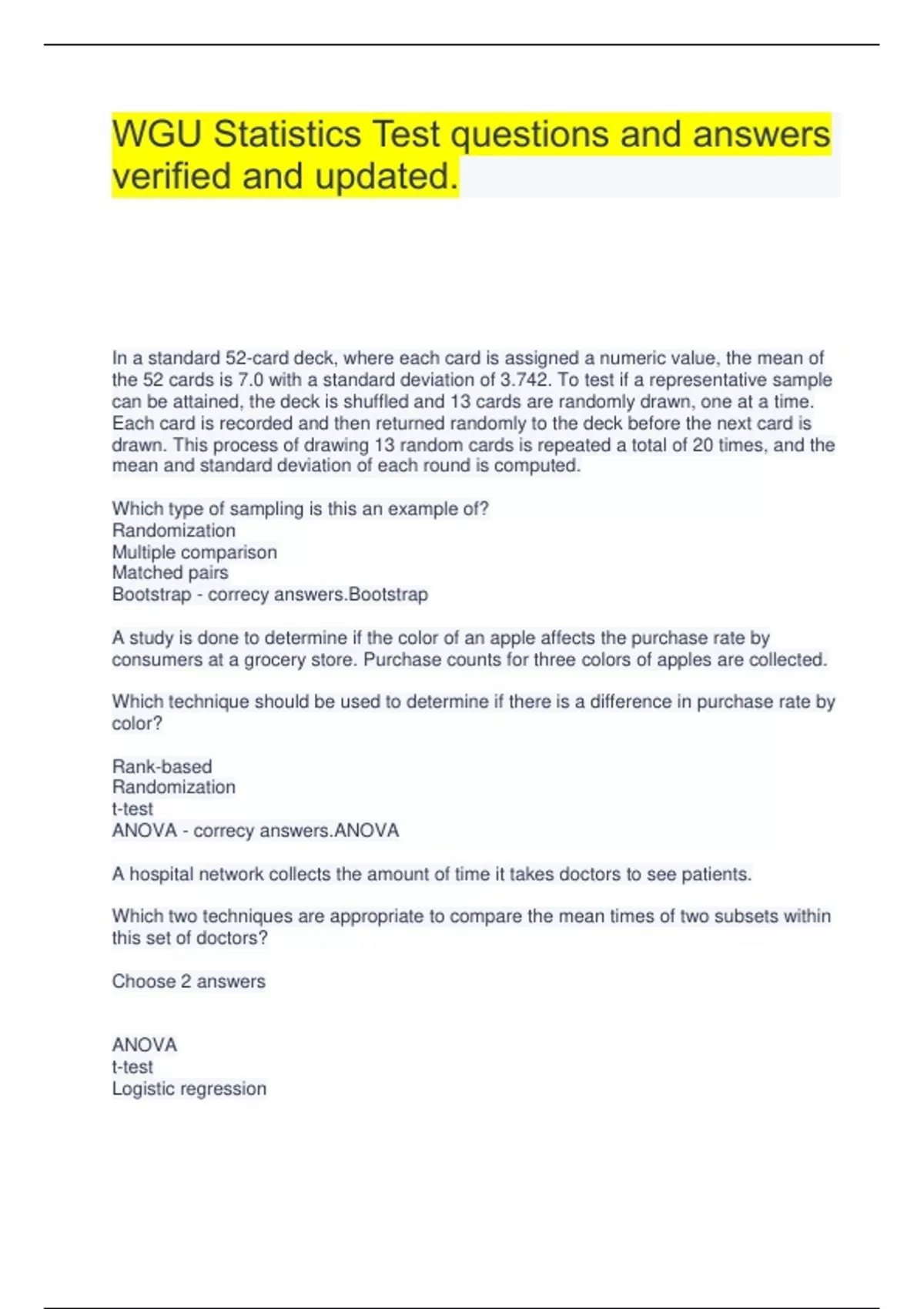 WGU Statistics Test questions and answers verified and updated. In a standard 52-card deck, where each card is assigned a numeric value, the mean of the 52 cards is 7.0 with a standard deviation of 3.742. To test if a representative sample can be attained, the deck is shuffled and 13 cards are randomly drawn, one at a time. Each card is recorded and then returned randomly to the deck before the next card is drawn. This process of drawing 13 random cards is repeated a total of 20 times, and the mean and standard deviation of each round is computed. Which type of sampling is this an example of? Randomization Multiple comparison Matched pairs Bootstrap - correcy answers.Bootstrap A study is done to determine if the color of an apple affects the purchase rate by consumers at a grocery store. Purchase counts for three colors of apples are collected. Which technique should be used to determine if there is a difference in purchase rate by color? Rank-based Randomization t-test ANOVA - correcy answers.ANOVA A hospital network collects the amount of time it takes doctors to see patients. Which two techniques are appropriate to compare the mean times of two subsets within this set of doctors? Choose 2 answers ANOVA t-test Logistic regression Principal component analysis - correcy answers.ANOVA t-test A data analyst needs to determine whether antioxidants in blackberries can reduce age-related cognitive decline. Twenty-five adults between 65 and 80 are selected to eat blackberries for six months and be retested. The original scores are compared with the second scores to determine whether there was decline. What is the appropriate model to test the hypothesis? z test ANOVA Linear regression Two-sample t-test - correcy answers.Two-sample t-test Which assumption does a data analyst have to make when performing ANOVA on a dataset? There are just two parameters that are being estimated. The error terms follow a normal probability distribution. The parameters are additive. The explanatory variable is continuous. - correcy answers.The error terms follow a normal probability distribution. Which two assumptions are made when the linear regression model is used? Choose 2 answers Critical value is based on Fisher's exact test. Error terms are independent and identically distributed. Variances are not equal. Parameters β 0, β 1, and σ 2 are constant. - correcy answers.Error terms are independent and identically distributed. Parameters β 0, β 1, and σ 2 are constant. Which assumption is required to perform a two-sample t-test? Equal variance Large sample size Small sum of residuals Equal mean - correcy answers.Equal variance Given the following statistical model: y = 42 - 4.6 b Match each element of the model with its corresponding term. Answer options may be used more than once or not at all. Select your answers from the pull-down list. y Dependent variable Dependent variable 42 Intercept Intercept -4.6 Slope Slope b Independent variable Independent variable - correcy answers.y Dependent variable Dependent variable 42 Intercept Intercept -4.6 Slope Slope b Independent variable Independent variable Given the following generalized two-sample t-test equation: yi ,j = µi + εi ,j Classify each element in the equation. Answer options may be used more than once or not at all. Select your answers from the pull-down list. - correcy ,j Observed value Observed value µi Mean response Mean response εi ,j Error term Error term Given the following linear model: y i = β 0 + β 1 xi + ε i Classify each element correctly. Answer options may be used more than once or not at all. Select your answer from the pull-down list. - correcy answers.y i Response variable Response variable β 0 + β 1 xi Mean response Mean response xi Explanatory variable Explanatory variable A study comparing graduating cumulative GPAs from students with two different majors is conducted to study the effect of each major on academic achievement. From the list of all graduating students in both majors, a random sample of 30 students from Major