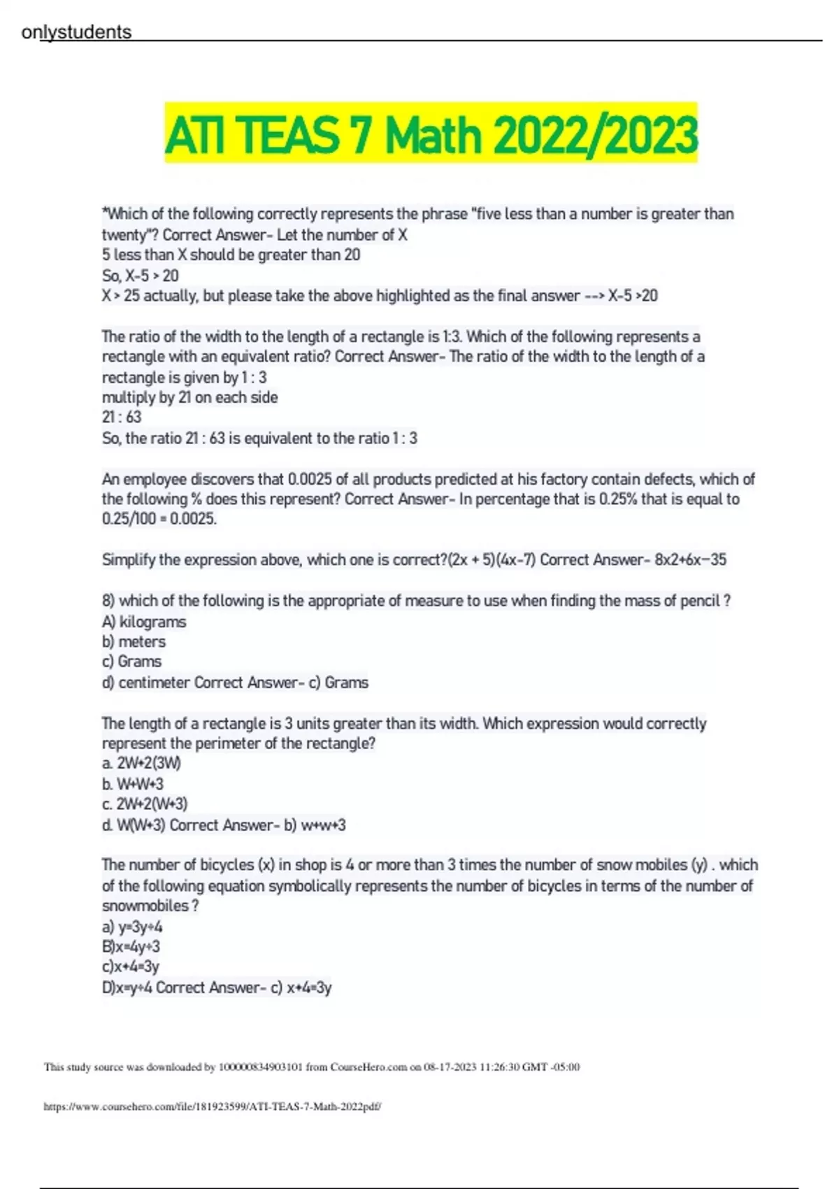 ATI TEAS 7 Math 2022/2023*Which of the following correctly represents the phrase "five less than a number is greater than twenty"? Correct Answer- Let the number of X 5 less than X should be greater than 20 So, X-5 20 X 25 actually, but please take the above highlighted as the final answer -- X-5 20 The ratio of the width to the length of a rectangle is 1:3. Which of the following represents a rectangle with an equivalent ratio? Correct Answer- The ratio of the width to the length of a rectangle is given by 1 : 3 multiply by 21 on each side 21 : 63 So, the ratio 21 : 63 is equivalent to the ratio 1 : 3 An employee discovers that 0.0025 of all products predicted at his factory contain defects, which of the following % does this represent? Correct Answer- In percentage that is 0.25% that is equal to 0.25/100 = 0.0025. Simplify the expression above, which one is correct?(2x + 5)(4x-7) Correct Answer- 8x2+6x−35 8) which of the following is the appropriate of measure to use when finding the mass of pencil ? A) kilograms b) meters c) Grams d) centimeter Correct Answer- c) Grams The length of a rectangle is 3 units greater than its width. Which expression would correctly represent the perimeter of the rectangle? a. 2W+2(3W) b. W+W+3 c. 2W+2(W+3) d. W(W+3) Correct Answer- b) w+w+3 The number of bicycles (x) in shop is 4 or more than 3 times the number of snow mobiles (y) . which of the following equation symbolically represents the number of bicycles in terms of the number of snowmobiles ? a) y=3y÷4 B)x=4y÷3 c)x+4=3y D)x=y÷4 Correct Answer- c) x+4=3y This study source was downloaded by from CourseH on :26:30 GMT -05:00 onlystudents Which of the following is correct comparison of two rational numbers? Correct Answer- 0.64/7 A vertical meter stick casts a shadow of 0.4 meters. If a tree casts a shadow of 12 meters at the same time, how tall is the tree? Correct Answer- x=30 meters Which of the following point of fraction with a common denominator are equivalent to 1/4 and 2/5? Correct Answer- 5/20, 8/20 The table shows a survey of auto mobile color preference. Which of the following statements about the survey responses is correct? Correct Answer- From the frequency table we can see that frequency for red is 6 and frequency of white is 6 . That is frequency of red or white is 6+6 = 12 That means 12 survey respondent preferred White or Red . This is the correct statement If the pediatric unit of a hospital has 165 beds, how many rooms are there if each room holds 3 beds? Correct Answer- 165/3=55 A student starts working for $12 per hour. After a year he gets a raise and earns $13.50 per hour. Which of the following represents the increase in the students wage? Correct Answer- Starting salary is $ 12 per hour After raise his present salary is $ 13.5 per hour. So increase in wage is (13.5 - 12) = $ 1.5 per hour. Percentage increase in wage is: = $12.50 1.5x100/12=12.5 A student rounds a number to 12.9. Which of the following possible value is the original number? Correct Answer- The most possible value of the original number is 12.939, because on rounding off to the nearest tenths place , 12.939 gives 12.9 Which of the following percentages is equivalent to 31/50 (round to two decimal places). a. 1.61% b. 16.13% c. 62.00% d. 0.62% Correct Answer- d) 0.62% A patient drives 19 miles one way to medical facility for treatment. How far does the patient drive round trip in 22 days of treatment? Correct Answer- Total distance per day =2x19=38 miles Total 22 days of treatment =38x22= 836miles Simplify the expression above which of the following is correct?