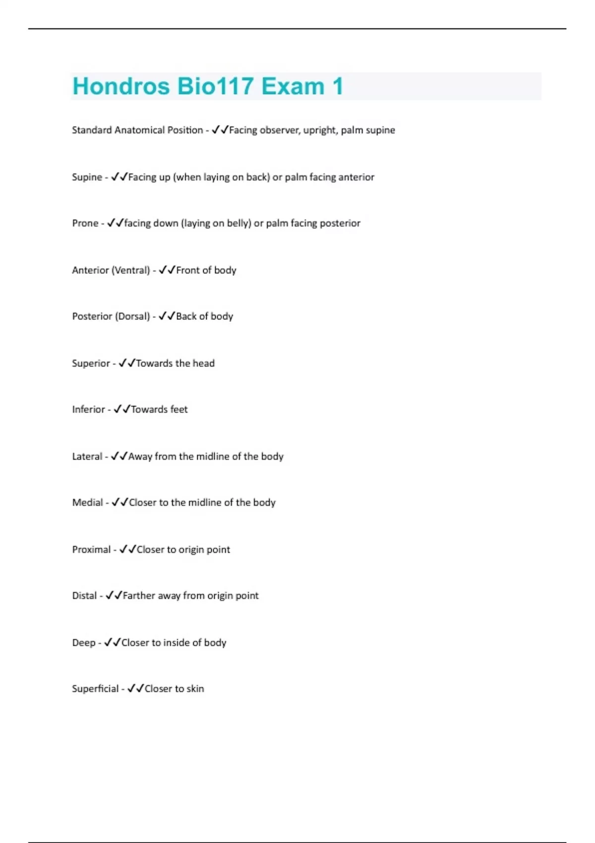 Standard Anatomical Position - Facing observer, upright, palm supine Supine - Facing up (when laying on back) or palm facing anterior Prone - facing down (laying on belly) or palm facing posterior Anterior (Ventral) - Front of body Posterior (Dorsal) - Back of body Superior - Towards the head Inferior - Towards feet Lateral - Away from the midline of the body Medial - Closer to the midline of the body Proximal - Closer to origin point Distal - Farther away from origin point Deep - Closer to inside of body Superficial - Closer to skinSagittal Plane - Divides body into left and right side Frontal (coronal) Plane - Divides body into anterior and posterior Transverse (Horizontal) Plane - divides body in superior and inferior Dorsal body Cavity - Contains cranial cavity and vertebral canal Ventral Body Cavity - Contains Thoracic, abdominal, and pelvic cavities Diaphragm - divides thoracic and abdominopelvic cavities in two