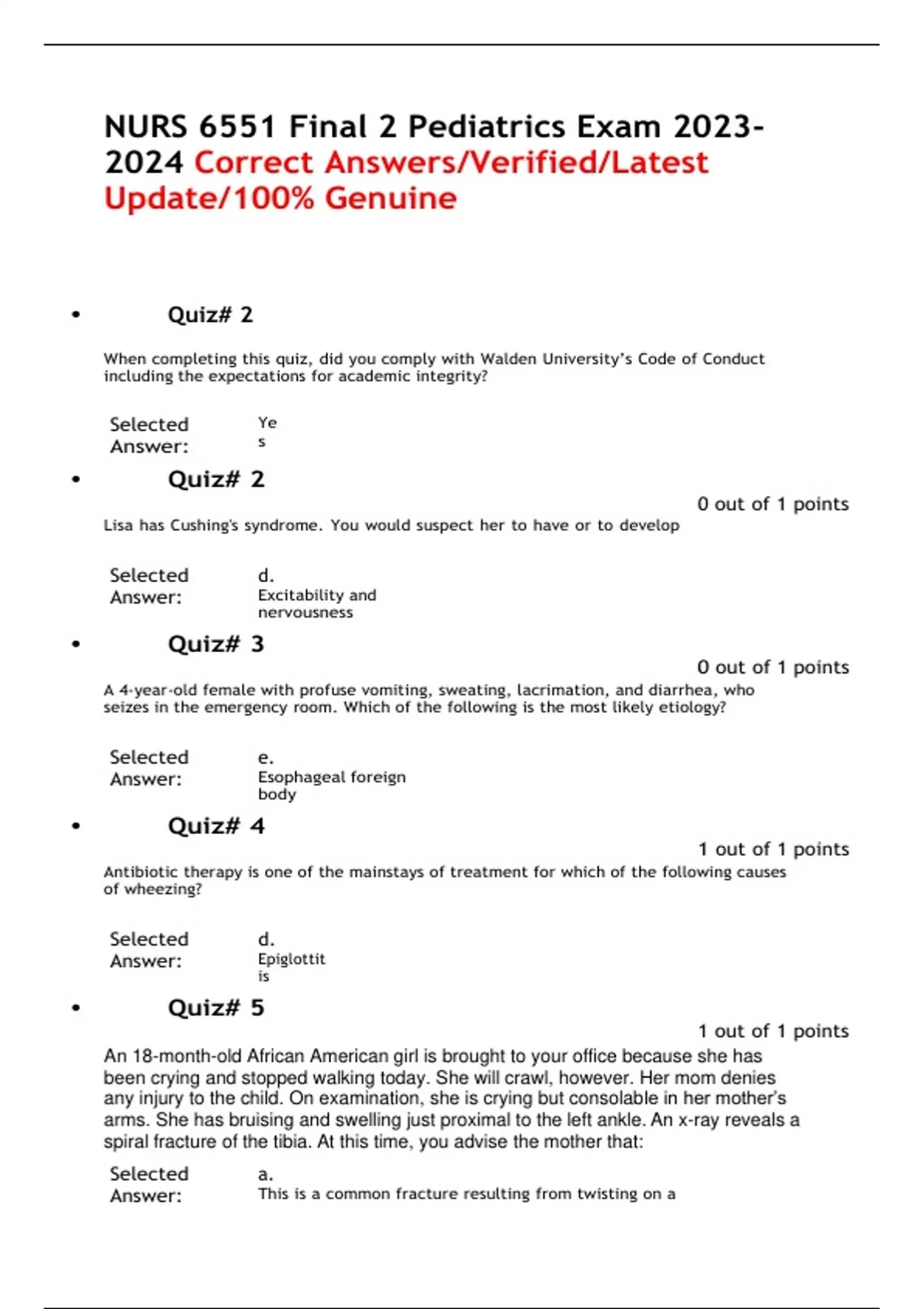 NURS 6551 Final 2 Pediatrics Exam Correct Answers/Verified/Latest Update/100% Genuine
