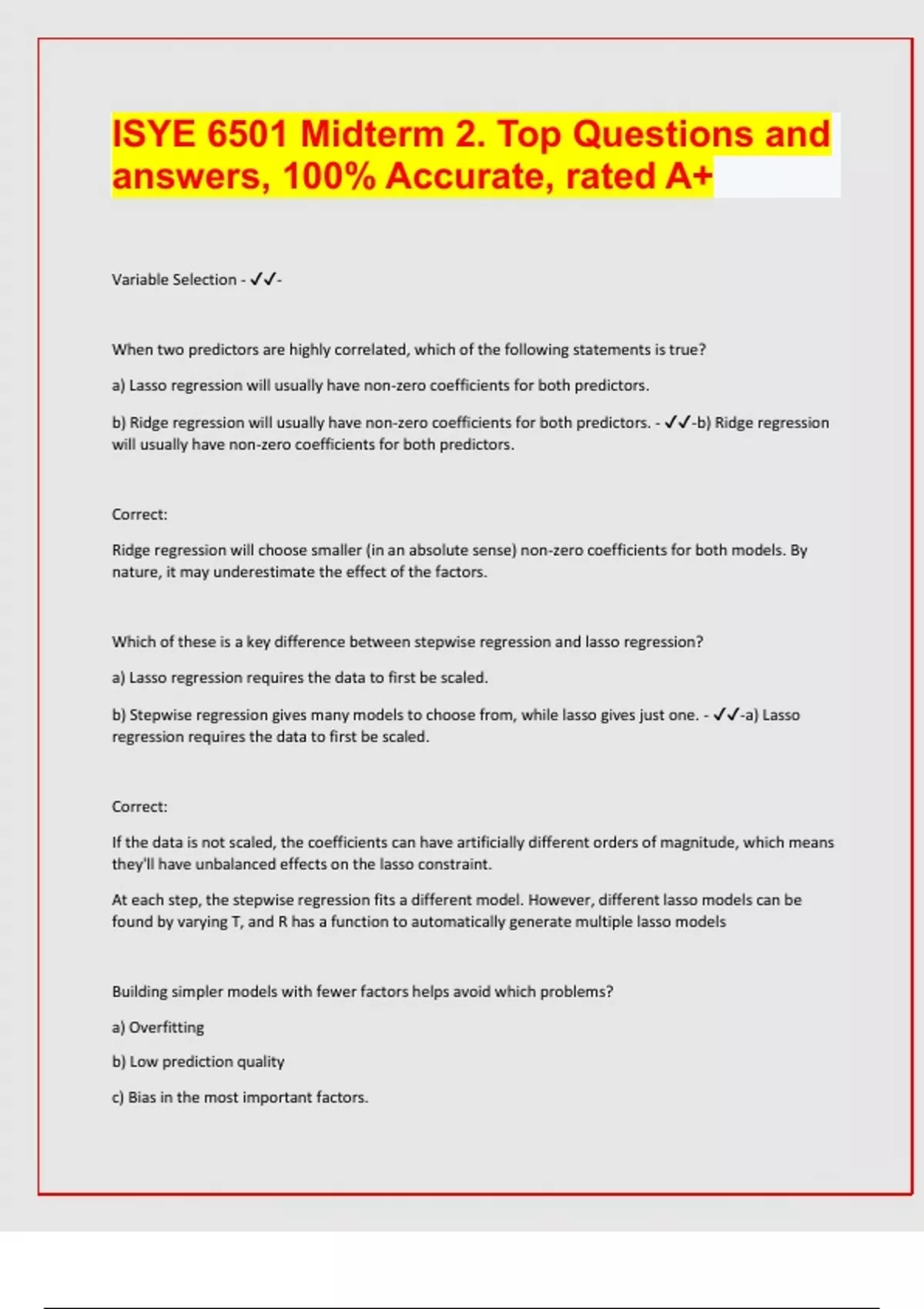 ISYE 6501 Midterm 2. Top Questions and answers, 100% Accurate, rated A+ Variable Selection - - When two predictors are highly correlated, which of the following statements is true? a) Lasso regression will usually have non-zero coefficients for both predictors. b) Ridge regression will usually have non-zero coefficients for both predictors. - -b) Ridge regression will usually have non-zero coefficients for both predictors. Correct: Ridge regression will choose smaller (in an absolute sense) non-zero coefficients for both models. By nature, it may underestimate the effect of the factors. Which of these is a key difference between stepwise regression and lasso regression? a) Lasso regression requires the data to first be scaled. b) Stepwise regression gives many models to choose from, while lasso gives just one. - -a) Lasso regression requires the data to first be scaled. Correct: If the data is not scaled, the coefficients can have artificially different orders of magnitude, which means they'll have unbalanced effects on the lasso constraint. At each step, the stepwise regression fits a different model. However, different lasso models can be found by varying T, and R has a function to automatically generate multiple lasso models Building simpler models with fewer factors helps avoid which problems? a) Overfitting