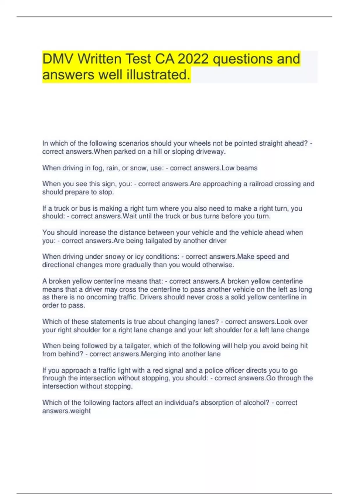 DMV Written Test CA 2022 questions and answers well illustrated. In which of the following scenarios should your wheels not be pointed straight ahead? - correct answers.When parked on a hill or sloping driveway. When driving in fog, rain, or snow, use: - correct answers.Low beams When you see this sign, you: - correct answers.Are approaching a railroad crossing and should prepare to stop. If a truck or bus is making a right turn where you also need to make a right turn, you should: - correct answers.Wait until the truck or bus turns before you turn. You should increase the distance between your vehicle and the vehicle ahead when you: - correct answers.Are being tailgated by another driver When driving under snowy or icy conditions: - correct answers.Make speed and directional changes more gradually than you would otherwise. A broken yellow centerline means that: - correct answers.A broken yellow centerline means that a driver may cross the centerline to pass another vehicle on the left as long as there is no oncoming traffic. Drivers should never cross a solid yellow centerline in order to pass. Which of these statements is true about changing lanes? - correct answers.Look over your right shoulder for a right lane change and your left shoulder for a left lane change When being followed by a tailgater, which of the following will help you avoid being hit from behind? - correct answers.Merging into another lane If you approach a traffic light with a red signal and a police officer directs you to go through the intersection without stopping, you should: - correct answers.Go through the intersection without stopping. Which of the following factors affect an individual's absorption of alcohol? - correct t This white sign means: - correct in the right lane if you are driving slower than other traffic An orange and red triangular sign on a vehicle always means: - correct moving vehicle Fatigue increases the risk of: - correct answers.Falling asleep behind the wheel and crashing This sign means: - correct answers.Let cross traffic pass before proceeding Which of the following blocks the smooth flow of traffic? - correct answers.Slowing down to look at collision scene You want to make a right turn at an upcoming intersection. You should slow down and - correct answers.Signal for 100 feet before turning When driving in work zones, you should: - correct e your speed and be prepared to stop suddenly When backing up: - correct answers.Look through the rear window. You are approaching an intersection at the posted speed limit when signal turns yellow. You should - correct answers.Stop before entering the intersection if you can so safely A Person may legally ride in the back of a pickup truck when: - correct answers.In a secured seat and while using an approved safety belt. Which of these statements is true about drugs and driving? - correct answers.Even over the counter drugs can impair your driving When you are behind a motorcycle, you should: - correct answers.Allow a larger following distance. When driving at night on a dimly lit street, you should: - correct answers.Drive slowly enough so you can stop within the area lighted by your headlights This yellow sign means: - correct answers.Pedestrian crossing ahead You are approaching a green traffic light and traffic is blocking the intersection. What is the best thing to do? - correct answers.Don't enter the intersection until you can get completely across When being passed by another vehicle: - correct ain a constant speed