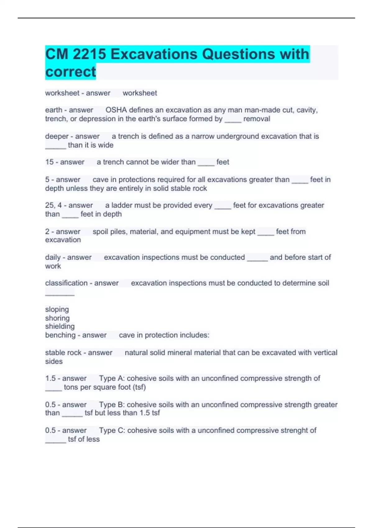 CM 2215 Excavations Questions with correct worksheet worksheet earth OSHA defines an excavation as any man man-made cut, cavity, trench, or depression in the earth's surface formed by ____ removal deeper a trench is defined as a narrow underground excavation that is _____ than it is wide 15 a trench cannot be wider than ____ feet 5 cave in protections required for all excavations greater than ____ feet in depth unless they are entirely in solid stable rock 25, 4 a ladder must be provided every ____ feet for excavations greater than ____ feet in depth 2 spoil piles, material, and equipment must be kept ____ feet from excavation daily excavation inspections must be conducted _____ and before start of work classification excavation inspections must be conducted to determine soil _______ sloping shoring shielding benching cave in protection includes: stable rock natural solid mineral material that can be excavated with vertical sides 1.5 Type A: cohesive soils with an unconfined compressive strength of ____ tons per square foot (tsf) 0.5 Type B: cohesive soils with an unconfined compressive strength greater than _____ tsf but less than 1.5 tsf 0.5 Type C: cohesive soils with a unconfined compressive strenght of _____ tsf of less 12 Type A soil can be sloped at a ratio of 1/2 : 1 if the excavation will be open for less than 24 hours and is less than _____ feet in depth 20 any excavation more than ____ feet in depth requires a qualified person to design the protection manual the classification of soil shall be made based on the results of at least one visual and one ______ analysis conducted by a competent person notes notes