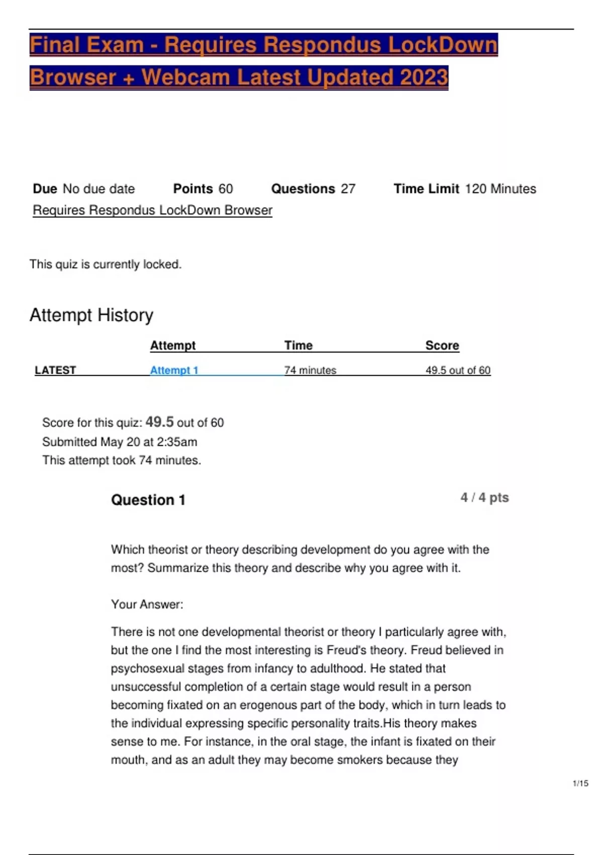 Final Exam - Requires Respondus LockDown Browser + Webcam Latest Updated 2023 Due No due date Points 60 Questions 27 Time Limit 120 Minutes Requires Respondus LockDown Browser This quiz is currently locked. Attempt History Attempt Time Score LATEST Attempt 1 74 minutes 49.5 out of 60 Score for this quiz: 49.5 out of 60 Submitted May 20 at 2:35am This attempt took 74 minutes. Question 1 4 / 4 pts Which theorist or theory describing development do you agree with the most? Summarize this theory and describe why you agree with it. Your Answer: There is not one developmental theorist or theory I particularly agree with, but the one I find the most interesting is Freud's theory. Freud believed in psychosexual stages from infancy to adulthood. He stated that unsuccessful completion of a certain stage would result in a person becoming fixated on an erogenous part of the body, which in turn leads to the individual expressing specific personality traits.His theory makes sense to me. For instance, in the oral stage, the infant is fixated on their mouth, and as an adult they may become smokers because they 2/15 continually seek pleasure to the mouth. 3/15 fixated Your Answer: fixated Freud believed that unsuccessful completion of a psychosexual stage would result in a person becoming on an erogenous part of the body. Question 2 1 / 1 pts Anal Your Answer: anal Freud would say that a person obsessed with cleanliness may have unsuccessfully completed the psychosexual stage. Question 3 1 / 1 pts 2 pts for sufficiently detailed and accurate summary. 2 points for well-supported reason for agreement. 4/15 Correct! False True True or false? Maternal stress is not an example of a teratogen. Question 5 2 / 2 pts Which research design would best address the following question: Are age and wisdom related to one another? Naturalistic Observation Case Study Survey Question 6 2 / 2 pts 22-26 weeks Your Answer: 16 What is the current age of viability? Question 4 0 / 2 pts 5/15 Question 7 6 / 10 pts Thoroughly answer the essay question. Essays should be written in complete sentences. Compare and contrast Assimilation and Accommodation. In your answer, be sure to describe each and describe how they differ from one another. Then, give a specific example of each. Finally, give a personal example of when you engaged in either assimilation or accommodation (be sure to say which one that you are describing!). Note: the module video used the example of eating food to illustrate these points. You must choose different examples. Your Answer: Assimilation and accommodation both involve processing new information. Assimilation is when you use exisiting schemes to make sense of new information. An example of this would be when a person is cooking and they come across a term they do not recognize in the recipe, they use context clues to figure out the meaning. Accommodation is when you take in new information and relate it to existing schemas. An example of this would be when a person is in school and associates a new concept with something they have already learned. A personal example I have of acommodation is from learning new concepts in this class and associated to exisitng things I have learned. Correct! Correlational Study Experiment 6/15 Correct! False True True or false? REM sleep makes up roughly half of an infant’s sleep cycle? Question 8 1 / 1 pts The reflex can be observed when adult places her finger in an infant’s palm, and the infant immediately closes his fingers around the adult finger. Your Answer: grasping Question 9 1 / 1 pts Descriptions of Assimilation need to describe how new information is taken in without changing underlying scheme. 2 pts. The example must accurately reflect this, in sufficient detail. 2 pts. Descriptions of Accomodation need to describe how schemes are changed in response to new information. 2 pts. The example must accurately reflect this, in sufficient detail. 2 pts. Two points for an accurately and sufficiently detailed personal example. Accommodation - see key 7/15 ou Answered Correct! Vygotsky Piaget This researcher underestimated how early children attain object permanence. Question 10 1 / 1 pts orrect Answe Vygotsky r Piaget This researcher viewed “nurture” over “nature” as the primary contributor to child cognitive development. Question 11 0 / 1 pts What does the Piagetian term, “Preoperations” mean? Why did Piaget use that term? Your Answer: Question 12 2 / 2 pts Grasping 8/15 Correct! False True True or false? According to Piaget, children in the Concrete Operational