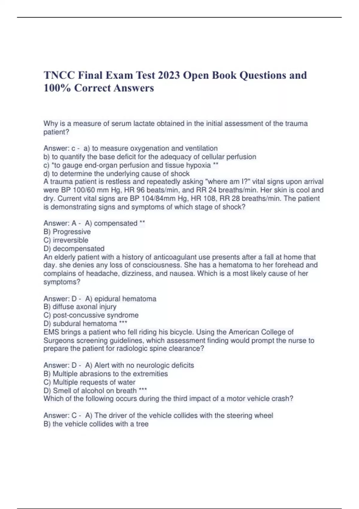 TNCC Final Exam Test 2023 Open Book Questions and 100% Correct Answers Why is a measure of serum lactate obtained in the initial assessment of the trauma patient? Answer: c - a) to measure oxygenation and ventilation b) to quantify the base deficit for the adequacy of cellular perfusion c) *to gauge end-organ perfusion and tissue hypoxia ** d) to determine the underlying cause of shock A trauma patient is restless and repeatedly asking "where am I?" vital signs upon arrival were BP 100/60 mm Hg, HR 96 beats/min, and RR 24 breaths/min. Her skin is cool and dry. Current vital signs are BP 104/84mm Hg, HR 108, RR 28 breaths/min. The patient is demonstrating signs and symptoms of which stage of shock? Answer: A - A) compensated ** B) Progressive C) irreversible D) decompensated An elderly patient with a history of anticoagulant use presents after a fall at home that day. she denies any loss of consciousness. She has a hematoma to her forehead and complains of headache, dizziness, and nausea. Which is a most likely cause of her symptoms? Answer: D - A) epidural hematoma B) diffuse axonal injury C) post-concussive syndrome D) subdural hematoma *** EMS brings a patient who fell riding his bicycle. Using the American College of Surgeons screening guidelines, which assessment finding would prompt the nurse to prepare the patient for radiologic spine clearance? Answer: D - A) Alert with no neurologic deficits B) Multiple abrasions to the extremities C) Multiple requests of water D) Smell of alcohol on breath *** Which of the following occurs during the third impact of a motor vehicle crash? Answer: C - A) The driver of the vehicle collides with the steering wheel B) the vehicle collides with a tree C) the aorta is torn at its attachment with the ligamentum arteriosum D) the airbag deploys and strikes the front seat passenger *** A passenger is brought to the emergency department of a rural hospital following a high-speed MVC. When significant abdominal and pelvic injuries are noted in the primary survey, which of the following is the priority interventions? Answer: A - A) initiate transfer to a trauma center ** B) provide report to the operating room nurse C) Obtained imaging studies D) Place a gastric tube Which of the following injuries is LEAST likely to be promptly identified? Answer: C - A) spleen B) lung C) bowel *** D) brain Patients with a crush injury should be monitored for which of the following conditions? Answer: C - A) Hypernatremia B) Hypercalcemia C) Dysrhthmias ** D) polyuria What finding raises suspicion of complete spinal cord injury? Answer: B - A) Weakness in the lower extremities B) Priapism *** C) voluntary anal sphincter tone D) intact reflexes distal to the injury A patient with a complete spinal cord injury in neurogenic shock will demonstrate hypotension and which other clinical signs? Answer: D - A) Bradycardia and ipsilateral absences of motor function B) Tachycardia and respiratory depression C) Tachycardia and absent motor function below the level of injury D) Bradycardia and absent motor function below the level of the injury *** A 5-year old child presents to the ED with bruises to the upper arms and buttocks in various stages of healing and multiple small, clean, round burns to the back. There are no abnormalities found based on the pediatric assessment triangle or primary survey. Which of the following is the priority nursing intervention? Answer: A - A) report your suspicion of the maltreatment in accordance with local regulations *** B) apply ice to the bruises and consult wound care C) engage in therapeutic communication to determine the MOI D) provide the family with injury prevention resourse A patient with lower extremity fracture complains of severe pain and tightness in his calf, minimally relieved by pain medications. Which of the following is the priority nursing intervention? Answer: C - A) elevating the extremity above the level of the heart B) repositioning and apply ice C) Elevating the extremity to the level of the heart *** D) Preparing the patient for ultrasound A 36-year old female has a deformity of the left wrist after a fall. She is reluctant to move her hand due to pain. Which of the following is the most appropriate intervention? Answer: B - A) apply a sling and elevate the extremity to the level of the heart. B) apply a splint and ELEVATE ABOVE THE LEVEL OF THE HEART *** C) Apply a sling and elevate the extremity above the level of the heart D) apply a splint and elevate the extremity to the level of the heart. Which of the following is a late sign of increased intracranial pressure? Answer: C Cushing Response
