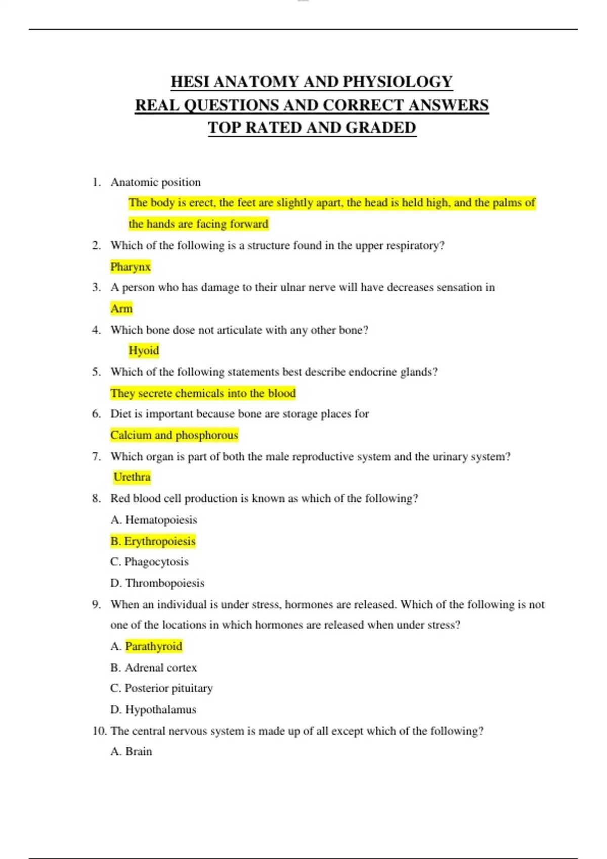 HESI ANATOMY AND PHYSIOLOGY REAL QUESTIONS AND CORRECT ANSWERS TOP RATED AND GRADED