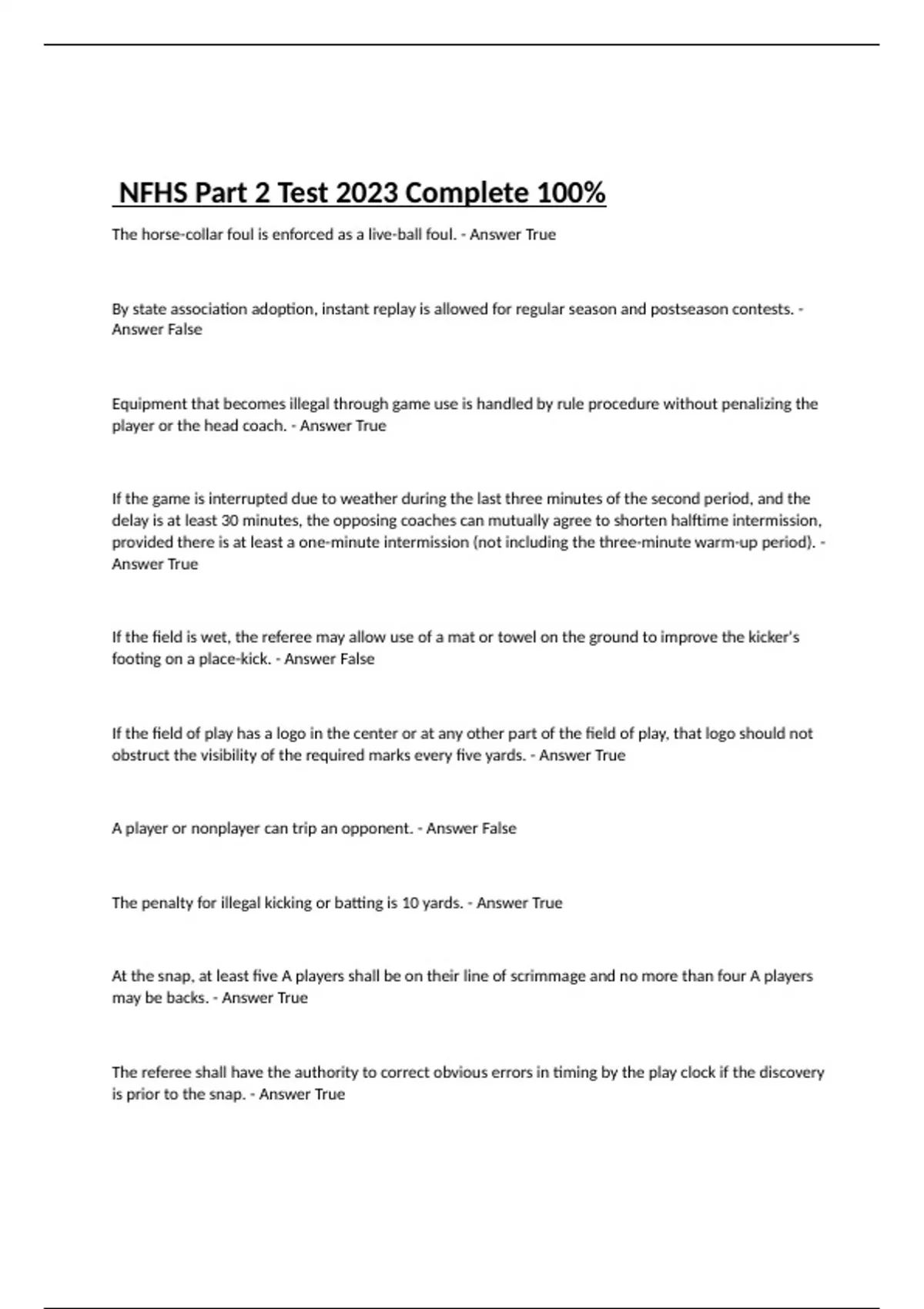 The horse-collar foul is enforced as a live-ball foul. - Answer True By state association adoption, instant replay is allowed for regular season and postseason contests. - Answer False Equipment that becomes illegal through game use is handled by rule procedure without penalizing the player or the head coach. - Answer True If the game is interrupted due to weather during the last three minutes of the second period, and the delay is at least 30 minutes, the opposing coaches can mutually agree to shorten halftime intermission, provided there is at least a one-minute intermission (not including the three-minute warm-up period). - Answer True If the field is wet, the referee may allow use of a mat or towel on the ground to improve the kicker's footing on a place-kick. - Answer False If the field of play has a logo in the center or at any other part of the field of play, that logo should not obstruct the visibility of the required marks every five yards. - Answer True A player or nonplayer can trip an opponent. - Answer False The penalty for illegal kicking or batting is 10 yards. - Answer True At the snap, at least five A players shall be on their line of scrimmage and no more than four A players may be backs. - Answer True The referee shall have the authority to correct obvious errors in timing by the play clock if the discovery is prior to the snap. - Answer True At the time the ball is kicked, at least four K players must be on each side of the kicker. - Answer True Effective with the 2020 season, the entire body of the number shall be a single solid color that clearly contrasts with the body color of the jersey. - Answer False It is legal for a player positioned directly behind the snapper to conserve time by intentionally throwing the ball forward to the ground immediately after receiving the snap that has neither been muffed nor touched the ground. - Answer True The play clock is set to 25 seconds when an official's time-out is taken for an injury to a defensive player or a defensive player has an equipment issue. - Answer False Following a legal kick when either team is awarded a new series, the play clock will be set to 25 seconds. - Answer True Each head coach shall designate a representative who will make decisions regarding penalty acceptance or declination. - Answer True It is not a foul for non-contact face-guarding on a forward pass. - Answer True Twenty-five seconds will be on the play clock and start on the ready-for-play signal prior to a try following a score. - Answer True The kicker or place-kick holder may be blocked as soon as the kick has touched the ground or any other player. - Answer True Game officials may use supplementary equipment to aid in game administration as authorized by the state association. - Answer True A disconcerting act foul is a 10-yard penalty. - Answer False When a backward pass strikes the ground, the ball becomes dead. - Answer False A simultaneous catch or recovery involves joint possession of a live ball by opposing players while one or both are inbounds. - Answer False