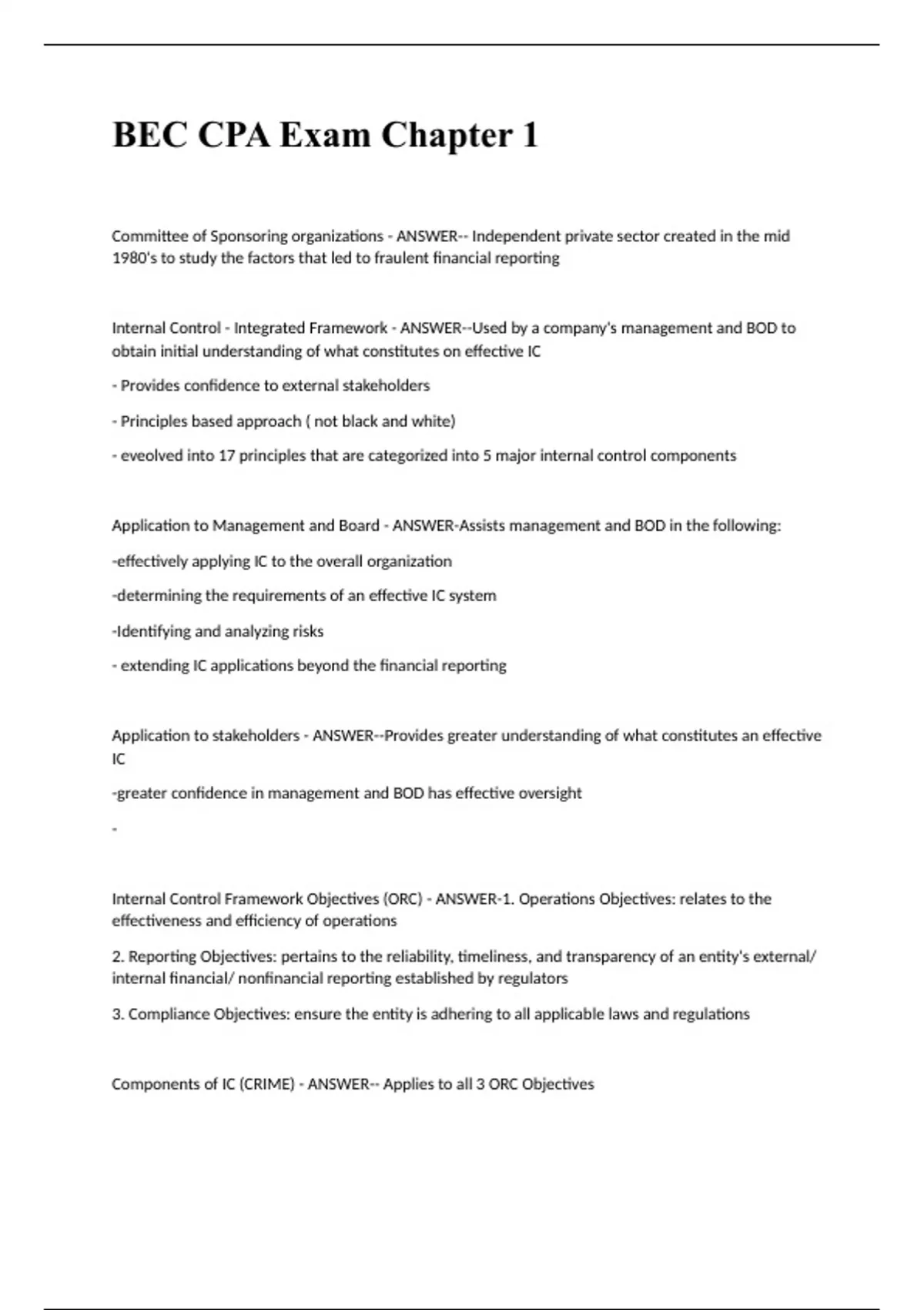 BEC CPA Exam Chapter 1 Committee of Sponsoring organizations - ANSWER-- Independent private sector created in the mid 1980's to study the factors that led to fraulent financial reporting Internal Control - Integrated Framework - ANSWER--Used by a company's management and BOD to obtain initial understanding of what constitutes on effective IC - Provides confidence to external stakeholders - Principles based approach ( not black and white) - eveolved into 17 principles that are categorized into 5 major internal control components Application to Management and Board - ANSWER-Assists management and BOD in the following: -effectively applying IC to the overall organization -determining the requirements of an effective IC system -Identifying and analyzing risks - extending IC applications beyond the financial reporting Application to stakeholders - ANSWER--Provides greater understanding of what constitutes an effective IC -greater confidence in management and BOD has effective oversight - Internal Control Framework Objectives (ORC) - ANSWER-1. Operations Objectives: relates to the effectiveness and efficiency of operations 2. Reporting Objectives: pertains to the reliability, timeliness, and transparency of an entity's external/ internal financial/ nonfinancial reporting established by regulators 3. Compliance Objectives: ensure the entity is adhering to all applicable laws and regulations Components of IC (CRIME) - ANSWER-- Applies to all 3 ORC Objectives