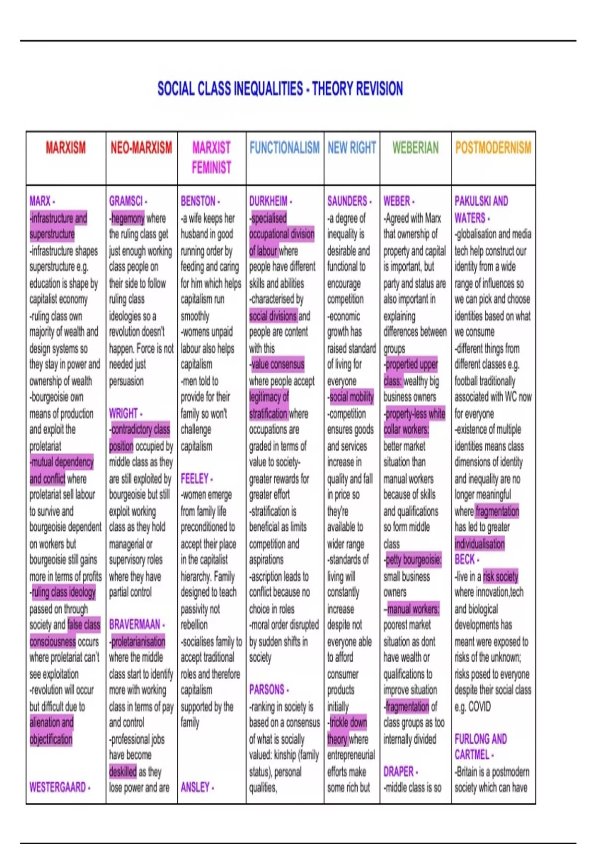 MARX - GRAMSCI - BENSTON - DURKHEIM - SAUNDERS - WEBER - PAKULSKI AND