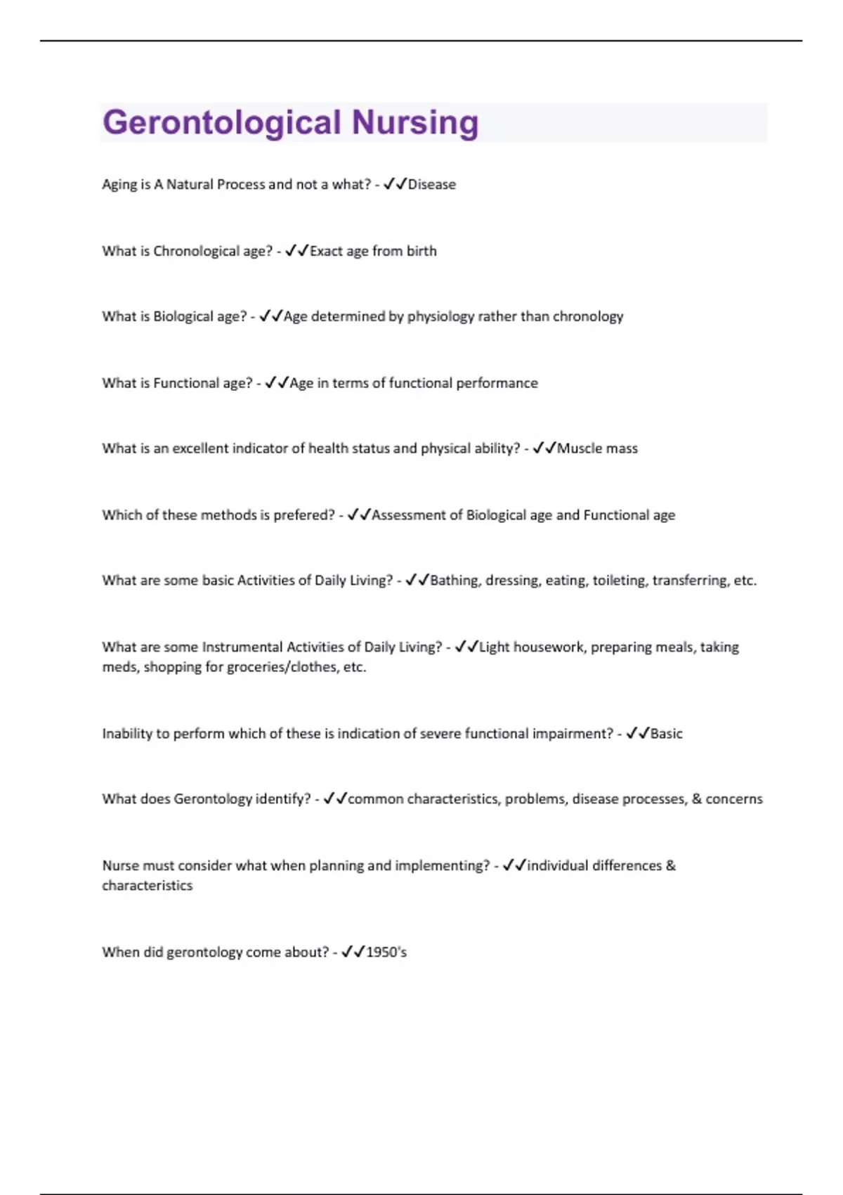 Aging is A Natural Process and not a what? - Disease What is Chronological age? - Exact age from birth What is Biological age? - Age determined by physiology rather than chronology What is Functional age? - Age in terms of functional performance What is an excellent indicator of health status and physical ability? - Muscle mass Which of these methods is prefered? - Assessment of Biological age and Functional age What are some basic Activities of Daily Living? - Bathing, dressing, eating, toileting, transferring, etc. What are some Instrumental Activities of Daily Living? - Light housework, preparing meals, taking meds, shopping for groceries/clothes, etc. Inability to perform which of these is indication of severe functional impairment? - Basic What does Gerontology identify? - common characteristics, problems, disease processes, & concerns Nurse must consider what when planning and implementing? - individual differences & characteristics When did gerontology come about? - 1950's