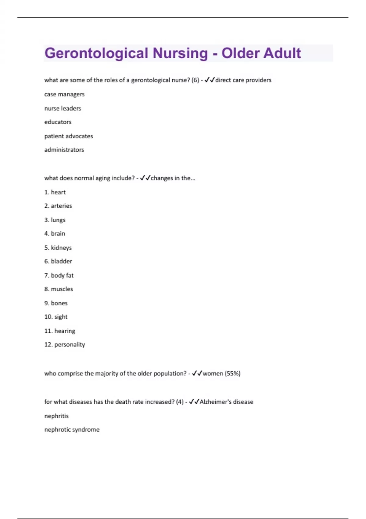 what are some of the roles of a gerontological nurse? (6) - direct care providers case managers nurse leaders educators patient advocates administrators what does normal aging include? - changes in the... 1. heart 2. arteries 3. lungs 4. brain 5. kidneys 6. bladder 7. body fat 8. muscles 9. bones 10. sight 11. hearing 12. personality who comprise the majority of the older population? - women (55%) for what diseases has the death rate increased? (4) - Alzheimer's disease nephritis nephrotic syndromenephrosis what diseases account for two-thirds of all deaths each year? - heart disease, cancer, stroke, chronic obstructive pulmonary disease and diabetes
