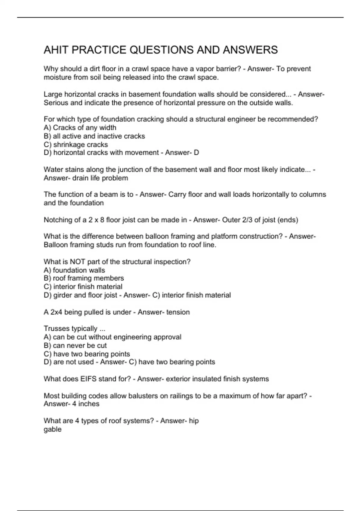 Why should a dirt floor in a crawl space have a vapor barrier? - Answer- To prevent moisture from soil being released into the crawl space. Large horizontal cracks in basement foundation walls should be considered... - Answer- Serious and indicate the presence of horizontal pressure on the outside walls. For which type of foundation cracking should a structural engineer be recommended? A) Cracks of any width B) all active and inactive cracks C) shrinkage cracks D) horizontal cracks with movement - Answer- D Water stains along the junction of the basement wall and floor most likely indicate... - Answer- drain life problem The function of a beam is to - Answer- Carry floor and wall loads horizontally to columns and the foundation Notching of a 2 x 8 floor joist can be made in - Answer- Outer 2/3 of joist (ends) What is the difference between balloon framing and platform construction? - Answer- Balloon framing studs run from foundation to roof line. What is NOT part of the structural inspection? A) foundation walls B) roof framing members C) interior finish material D) girder and floor joist - Answer- C) interior finish material A 2x4 being pulled is under - Answer- tension Trusses typically ... A) can be cut without engineering approval B) can never be cut C) have two bearing points D) are not used - Answer- C) have two bearing points What does EIFS stand for? - Answer- exterior insulated finish systems Most building codes allow balusters on railings to be a maximum of how far apart? - Answer- 4 inches What are 4 types of roof systems? - Answer- hip gable