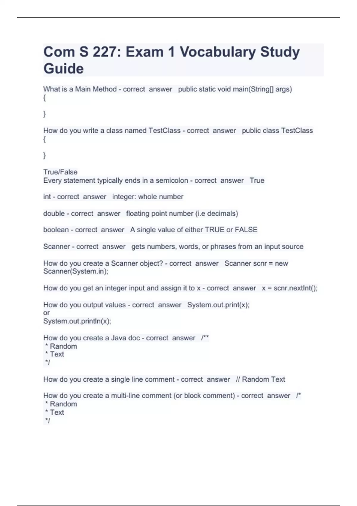 Com S 227 Question and answers already passed 2023 What is a Main Method - correct answer public static void main(String[] args) { } How do you write a class named TestClass - correct answer public class TestClass { } True/False Every statement typically ends in a semicolon - correct answer True int - correct answer integer: whole number double - correct answer floating point number (i.e decimals) boolean - correct answer A single value of either TRUE or FALSE Scanner - correct answer gets numbers, words, or phrases from an input source How do you create a Scanner object? - correct answer Scanner scnr = new Scanner(S); How do you get an integer input and assign it to x - correct answer x = Int(); How do you output values - correct answer S(x); or Sln(x);