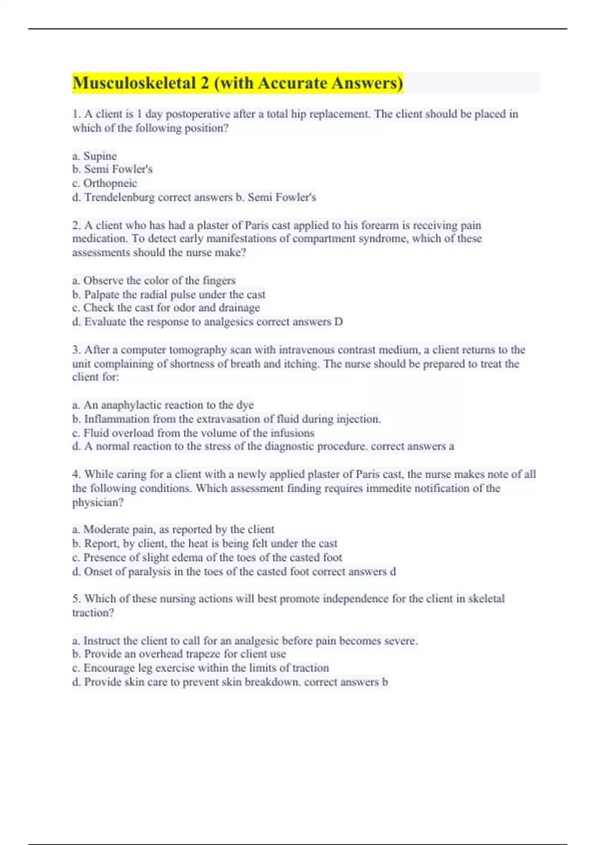 1. A client is 1 day postoperative after a total hip replacement. The client should be placed in which of the following position? a. Supine b. Semi Fowler's c. Orthopneic d. Trendelenburg correct answers b. Semi Fowler's 2. A client who has had a plaster of Paris cast applied to his forearm is receiving pain medication. To detect early manifestations of compartment syndrome, which of these assessments should the nurse make? a. Observe the color of the fingers b. Palpate the radial pulse under the cast c. Check the cast for odor and drainage d. Evaluate the response to analgesics correct answers D 3. After a computer tomography scan with intravenous contrast medium, a client returns to the unit complaining of shortness of breath and itching. The nurse should be prepared to treat the client for: a. An anaphylactic reaction to the dye b. Inflammation from the extravasation of fluid during injection. c. Fluid overload from the volume of the infusions d. A normal reaction to the stress of the diagnostic procedure. correct answers a 4. While caring for a client with a newly applied plaster of Paris cast, the nurse makes note of all the following conditions. Which assessment finding requires immedite notification of the physician? a. Moderate pain, as reported by the client b. Report, by client, the heat is being felt under the cast c. Presence of slight edema of the toes of the casted foot d. Onset of paralysis in the toes of the casted foot correct answers d 5. Which of these nursing actions will best promote independence for the client in skeletal traction? a. Instruct the client to call for an analgesic before pain becomes severe. b. Provide an overhead trapeze for client use c. Encourage leg exercise within the limits of traction d. Provide skin care to prevent skin breakdown. correct answers b
