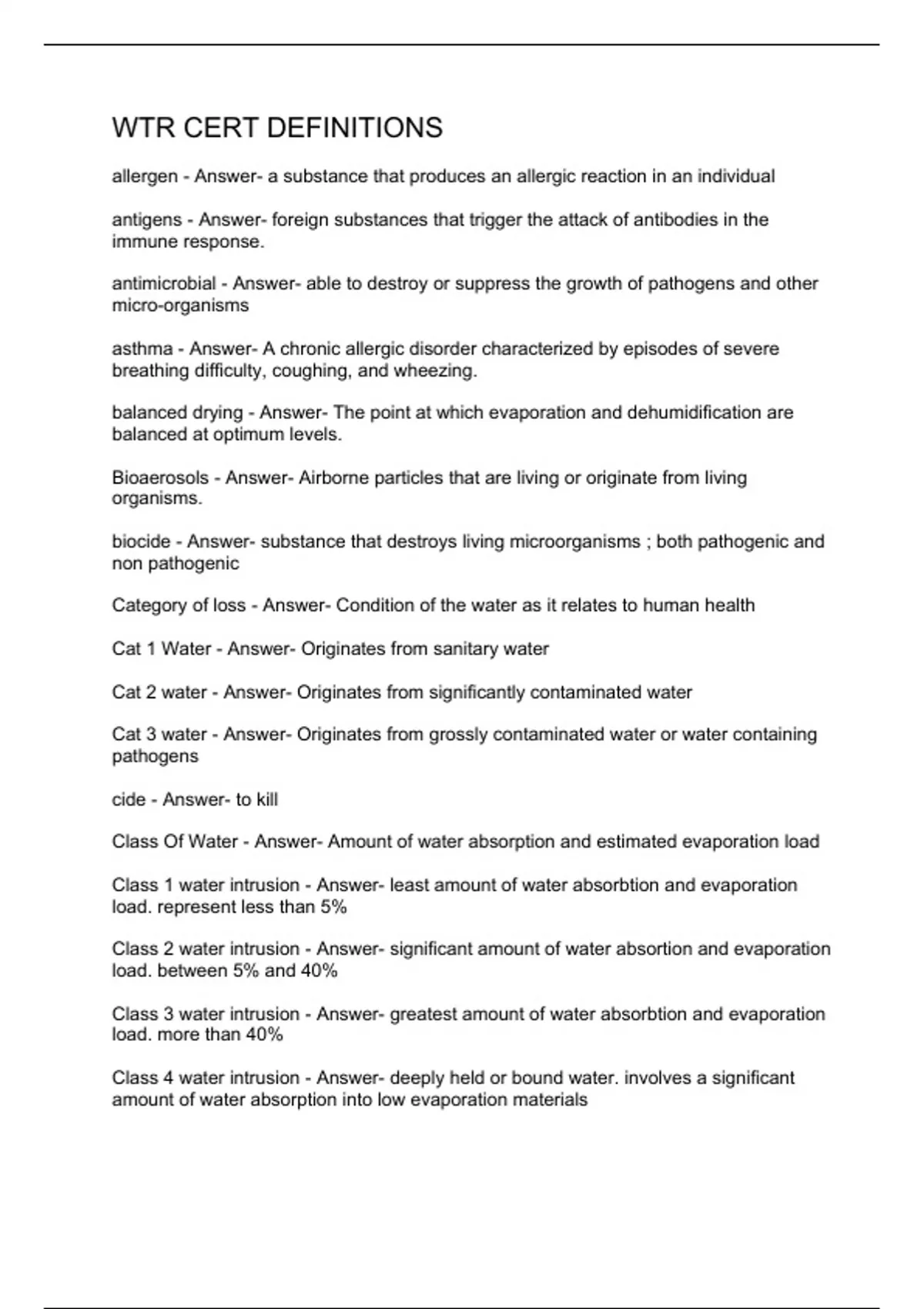 allergen - Answer- a substance that produces an allergic reaction in an individual antigens - Answer- foreign substances that trigger the attack of antibodies in the immune response. antimicrobial - Answer- able to destroy or suppress the growth of pathogens and other micro-organisms asthma - Answer- A chronic allergic disorder characterized by episodes of severe breathing difficulty, coughing, and wheezing. balanced drying - Answer- The point at which evaporation and dehumidification are balanced at optimum levels. Bioaerosols - Answer- Airborne particles that are living or originate from living organisms. biocide - Answer- substance that destroys living microorganisms ; both pathogenic and non pathogenic Category of loss - Answer- Condition of the water as it relates to human health Cat 1 Water - Answer- Originates from sanitary water Cat 2 water - Answer- Originates from significantly contaminated water Cat 3 water - Answer- Originates from grossly contaminated water or water containing pathogens cide - Answer- to kill Class Of Water - Answer- Amount of water absorption and estimated evaporation load Class 1 water intrusion - Answer- least amount of water absorbtion and evaporation load. represent less than 5% Class 2 water intrusion - Answer- significant amount of water absortion and evaporation load. between 5% and 40% Class 3 water intrusion - Answer- greatest amount of water absorbtion and evaporation load. more than 40% Class 4 water intrusion - Answer- deeply held or bound water. involves a significant amount of water absorption into low evaporation materials