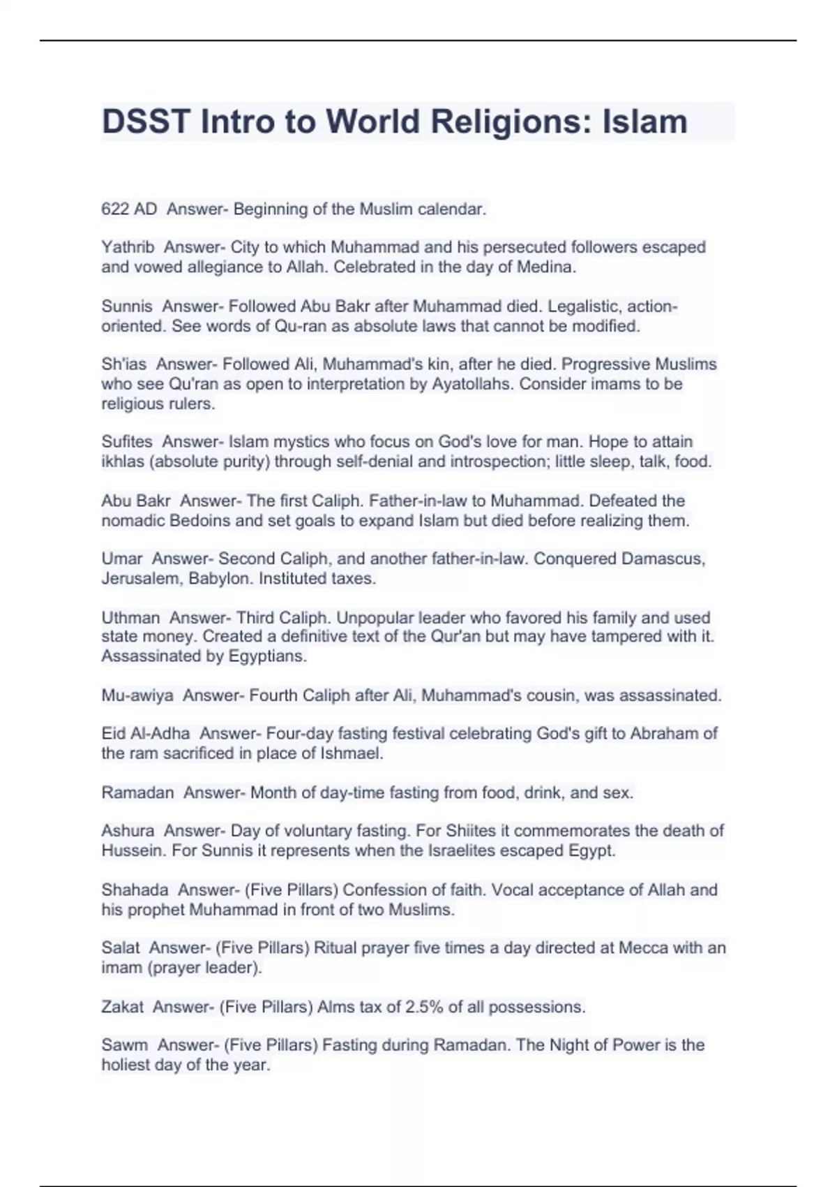 DSST Intro to World Religions: Islam