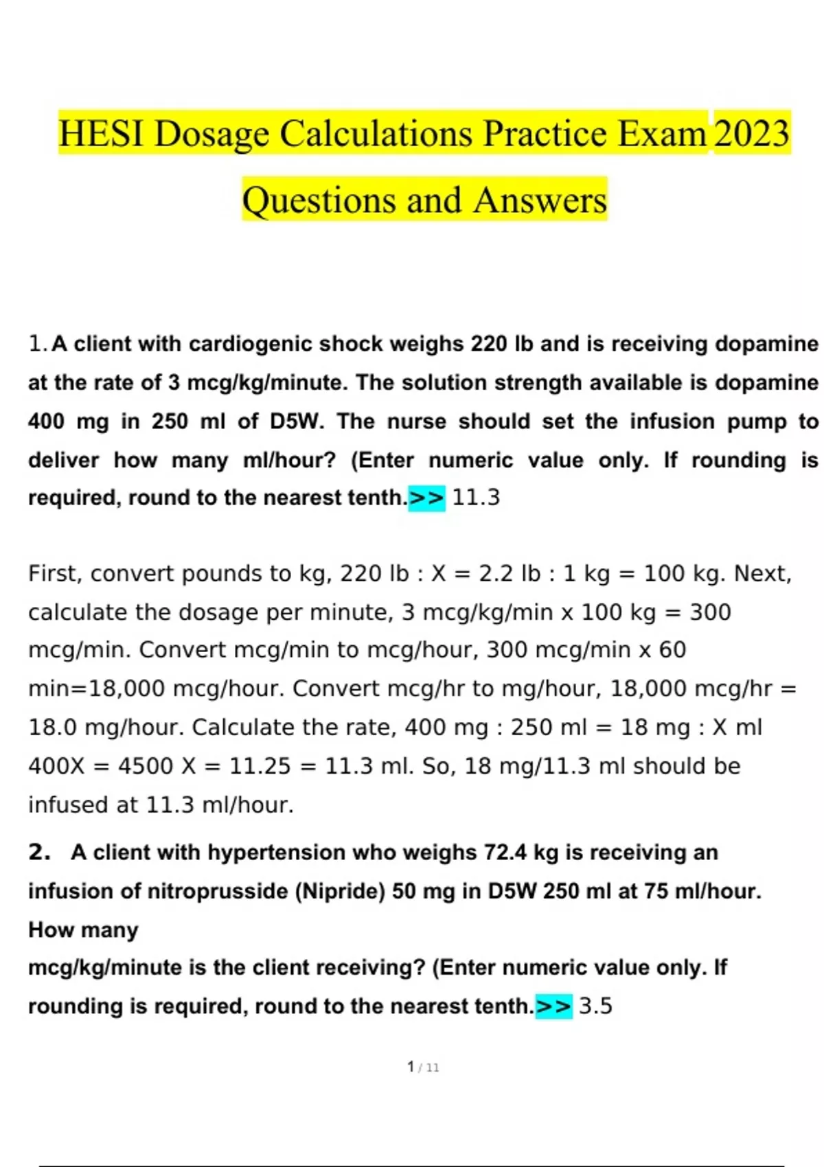 HESI Dosage Calculations Practice Exam questions and answers latest [100% correct answers]