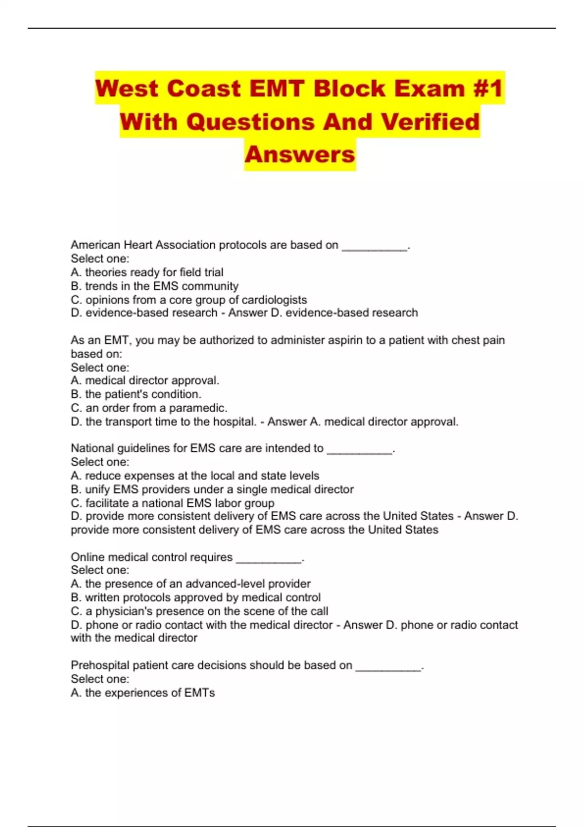 West Coast EMT Block Exam #1 With Questions And Verified Answers...