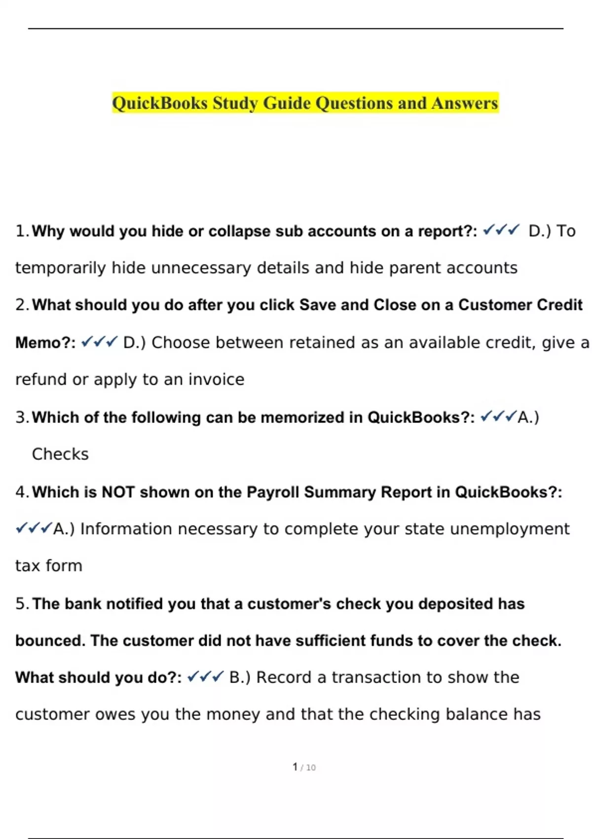 QuickBooks Study Guide Questions and Answers (Parts 1-3) with complete solution