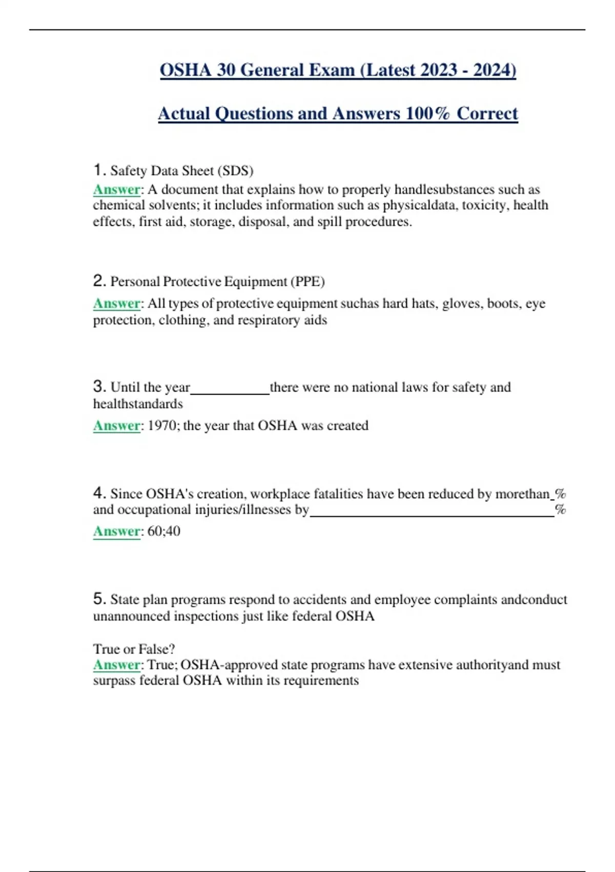 OSHA 30 General Exam (Latest ) Actual Questions and Answers 100% Correct 1. Safety Data Sheet (SDS) Answer: A document that explains how to properly handlesubstances such as chemical solvents; it includes information such as physicaldata, toxicity, health effects, first aid, storage, disposal, and spill procedures. 2. Personal Protective Equipment (PPE) Answer: All types of protective equipmentsuchas hard hats, gloves, boots, eye protection, clothing, and respiratory aids 3. Until the year there were no national laws for safety and healthstandards Answer: 1970; the year that OSHA was created 4. Since OSHA's creation, workplace fatalities have been reduced by morethan % and occupational injuries/illnesses by % Answer: 60;40 5. State plan programs respond to accidents and employee complaints andconduct unannounced inspections just like federal OSHA True or False? Answer: True; OSHA-approved state programs have extensive authorityand must surpass federal OSHA within its requirements