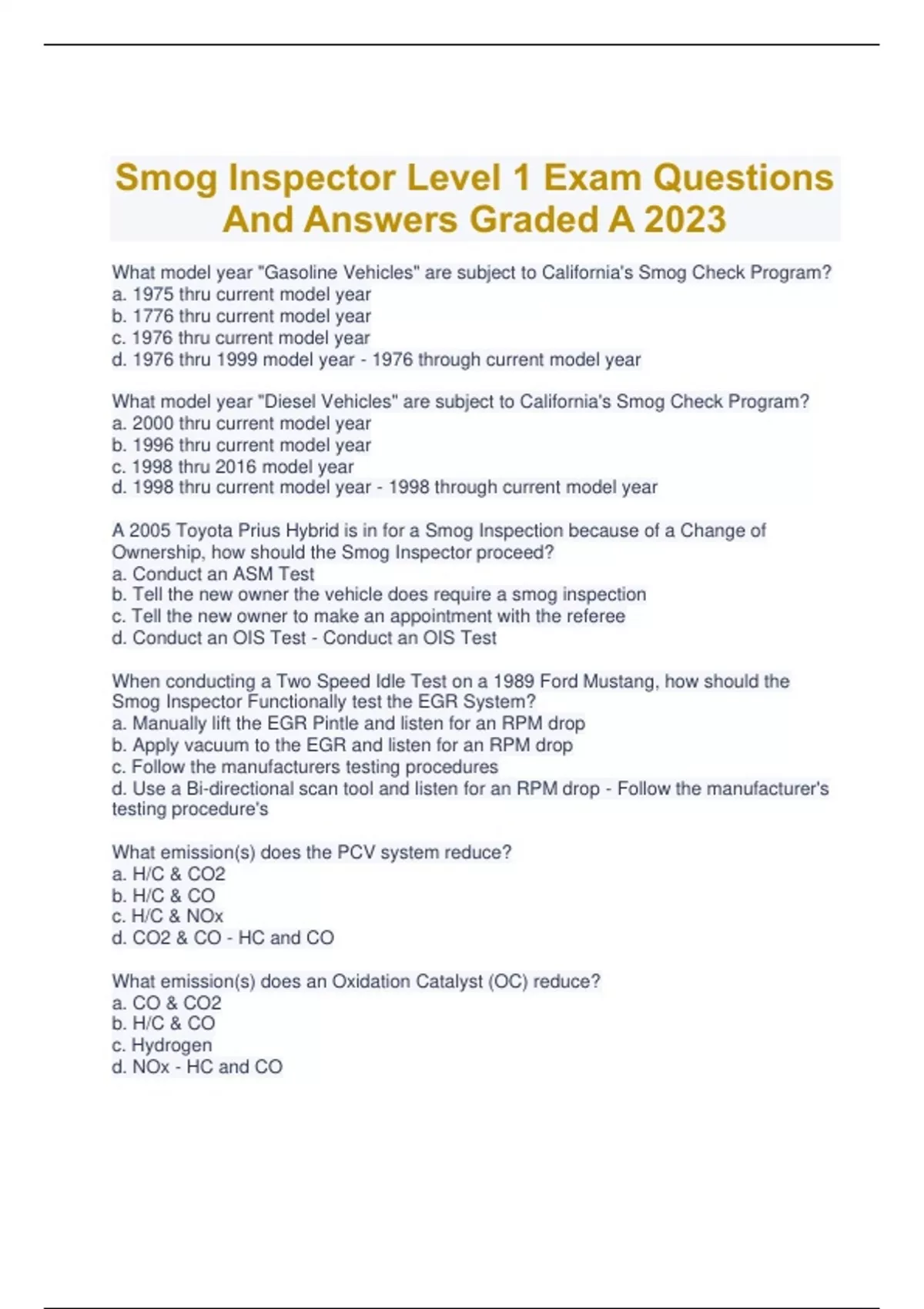 What model year "Gasoline Vehicles" are subject to California's Smog Check Program? a. 1975 thru current model year b. 1776 thru current model year c. 1976 thru current model year d. 1976 thru 1999 model year - 1976 through current model year What model year "Diesel Vehicles" are subject to California's Smog Check Program? a. 2000 thru current model year b. 1996 thru current model year c. 1998 thru 2016 model year d. 1998 thru current model year - 1998 through current model year A 2005 Toyota Prius Hybrid is in for a Smog Inspection because of a Change of Ownership, how should the Smog Inspector proceed? a. Conduct an ASM Test b. Tell the new owner the vehicle does require a smog inspection c. Tell the new owner to make an appointment with the referee d. Conduct an OIS Test - Conduct an OIS Test When conducting a Two Speed Idle Test on a 1989 Ford Mustang, how should the Smog Inspector Functionally test the EGR System? a. Manually lift the EGR Pintle and listen for an RPM drop b. Apply vacuum to the EGR and listen for an RPM drop c. Follow the manufacturers testing procedures d. Use a Bi-directional scan tool and listen for an RPM drop - Follow the manufacturer's testing procedure's What emission(s) does the PCV system reduce? a. H/C & CO2 b. H/C & CO c. H/C & NOx d. CO2 & CO - HC and CO