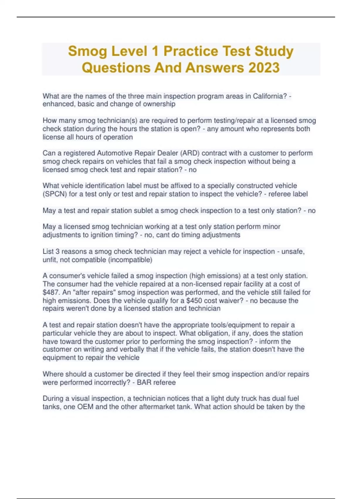 What are the names of the three main inspection program areas in California? - enhanced, basic and change of ownership How many smog technician(s) are required to perform testing/repair at a licensed smog check station during the hours the station is open? - any amount who represents both license all hours of operation Can a registered Automotive Repair Dealer (ARD) contract with a customer to perform smog check repairs on vehicles that fail a smog check inspection without being a licensed smog check test and repair station? - no What vehicle identification label must be affixed to a specially constructed vehicle (SPCN) for a test only or test and repair station to inspect the vehicle? - referee label May a test and repair station sublet a smog check inspection to a test only station? - no May a licensed smog technician working at a test only station perform minor adjustments to ignition timing? - no, cant do timing adjustments List 3 reasons a smog check technician may reject a vehicle for inspection - unsafe, unfit, not compatible (incompatible) A consumer's vehicle failed a smog inspection (high emissions) at a test only station. The consumer had the vehicle repaired at a non-licensed repair facility at a cost of $487. An "after repairs" smog inspection was performed, and the vehicle still failed for high emissions. Does the vehicle qualify for a $450 cost waiver? - no because the repairs weren't done by a licensed station and technician A test and repair station doesn't have the appropriate tools/equipment to repair a particular vehicle they are about to inspect. What obligation, if any, does the station have toward the customer prior to performing the smog inspection? - inform the customer on writing and verbally that if the vehicle fails, the station doesn't have the equipment to repair the vehicle Where should a customer be directed if they feel their smog inspection and/or repairs were performed incorrectly? - BAR referee During a visual inspection, a technician notices that a light duty truck has dual fuel tanks, one OEM and the other aftermarket tank. What action should be taken by the technician as a result of this finding? - Find EO# on aftermarket tank. If none found then fail the vehicle. During a visual inspection, the technician notices that an OEM air cleaner is missing, and a non-approved aftermarket cleaner is installed. What action should be taken by the technician as a result of this finding? - research APL and proceed accordingly During a visual inspection, OEM catalytic converter is noted as missing, and in its place is a small aftermarket catalytic converter. What action should be taken by the technician as a result of this finding? - find EO# When inspecting a kit car (SPCN), a grey market vehicle, or a vehicle with an engine change, the technician should look for a BAR referee label. What is the primary purpose of the BAR referee label? - takes place of under hood label and has vehicle information Some vehicles may experience difficulties conducting the OBD II functional test. BAR provides technical information about these vehicles. Where can this document be found and what is the name of this document? - OBD II test ability reference guide, located on BAR's website. An independent repair dealer may replace a defective emissions control part that may be covered under warranty. True or False? - True, but inform customer about their warranty's Where should a customer be directed when repairs for emissions failures were unsuccessful and the cost limit has been reached? What additional information/documentation does the customer need when being referred? - BAR referee, initial failure, invoice of repairs, after repairs failed test and additional invoice for repairs The law prohibits owners of vehicles to repair their own vehicles emissions failures. True or False? - false What type of certificate of compliance should be issued to military person not seeking California registration? - need copy of VR report passing result, not the final certification If a vehicle is going to the referee for a cost waiver, what documents should the customer bring to the referee? - initial failure, invoice of repairs, after repairs failed test and additional invoice for repairs In what document can a technician find the aftermarket parts verification guidelines? - smog check reference guide When entering parts cost for an after repairs test, what customer paid costs are to be entered? - all costs for diag, parts, labor rounded to the nearest dollar