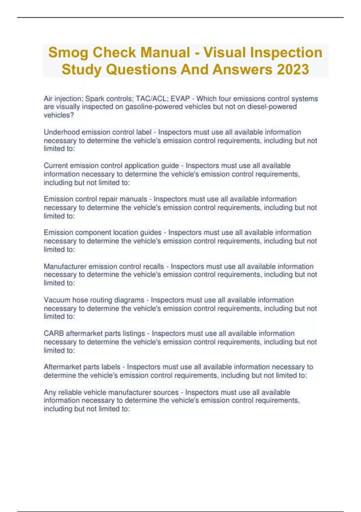 Smog Check Manual - Visual Inspection Study Questions And Answers 2023