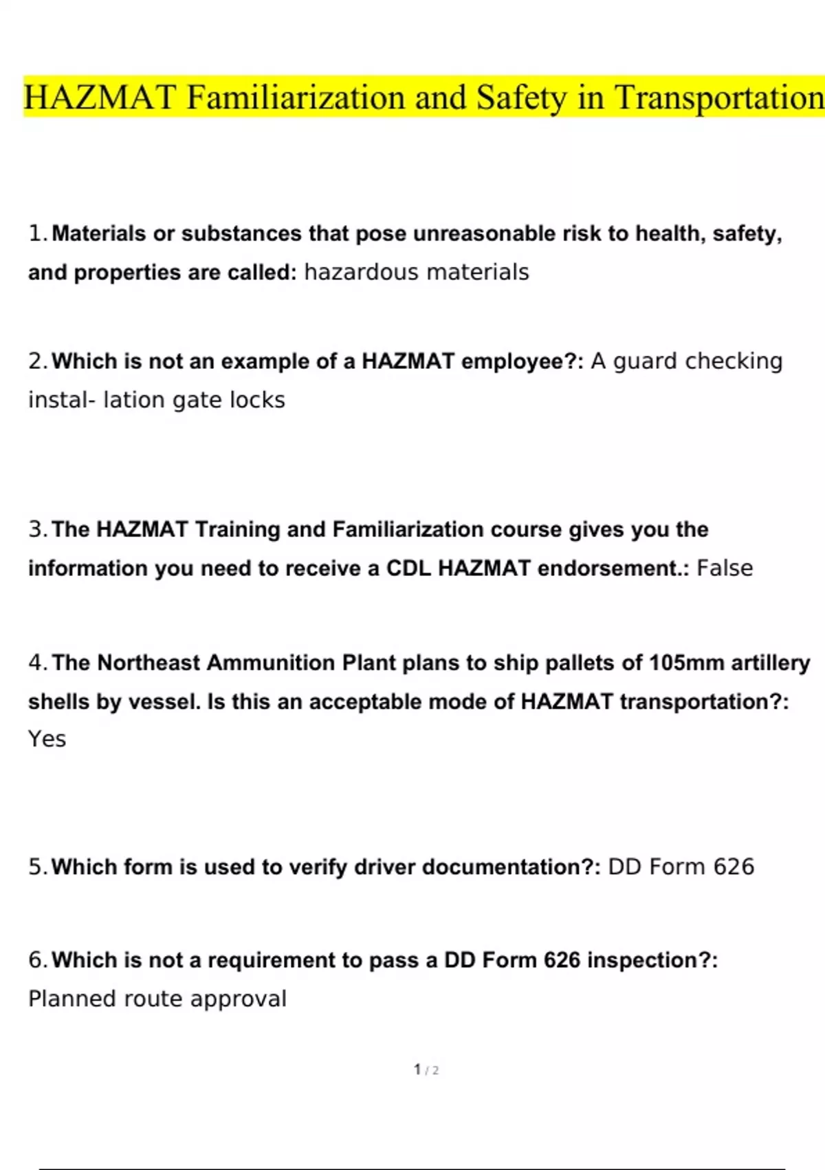 HAZMAT Familiarization and Safety in Transportation questions and answers latest [100% correct answers]