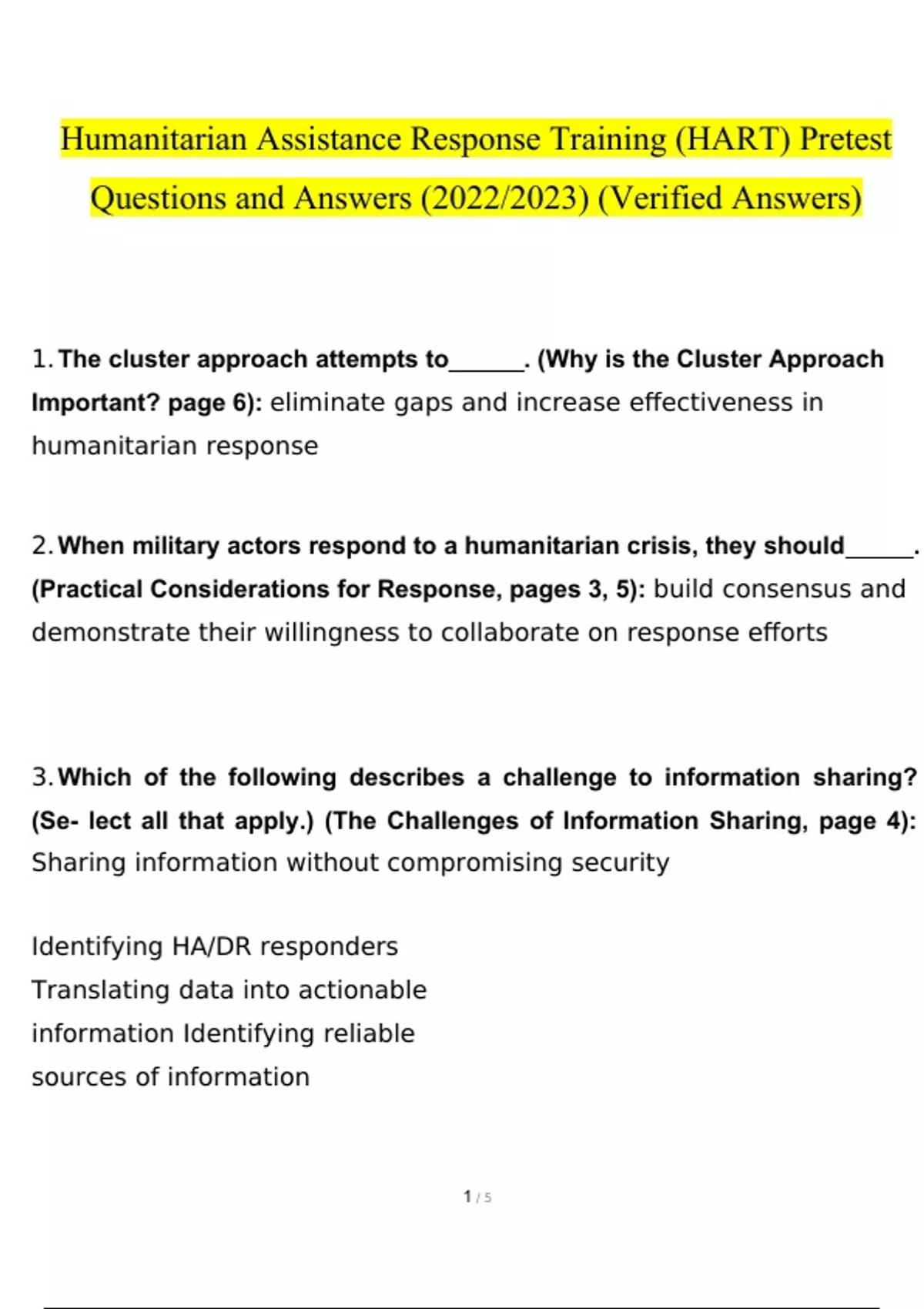 Humanitarian Assistance Response Training (HART) Pretest questions and answers latest [100% correct answers]