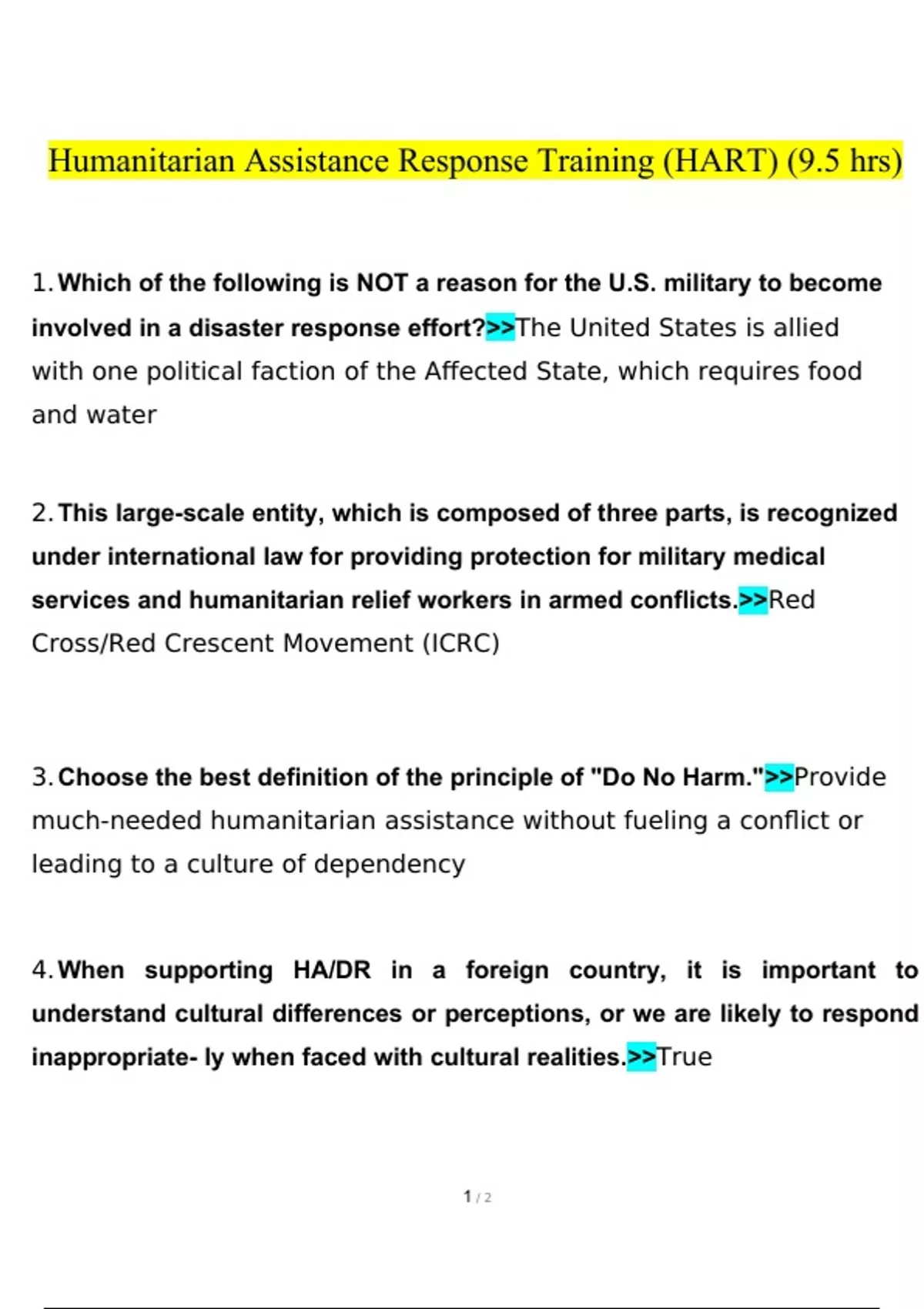 Humanitarian Assistance Response Training (HART) (9.5 hrs) questions and answers latest [100% correct answers]