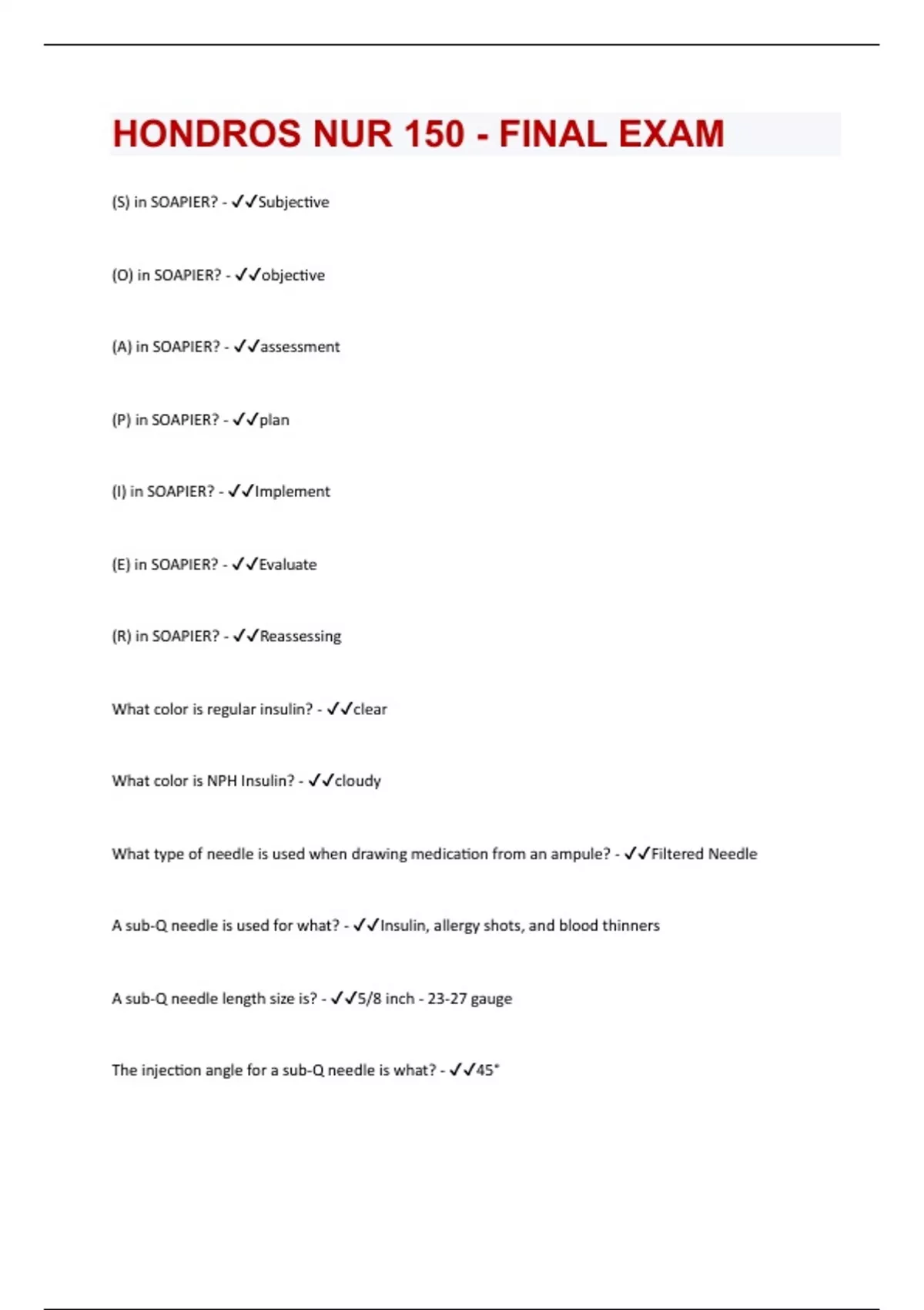 (S) in SOAPIER? - Subjective (O) in SOAPIER? - objective (A) in SOAPIER? - assessment (P) in SOAPIER? - plan (I) in SOAPIER? - Implement (E) in SOAPIER? - Evaluate (R) in SOAPIER? - Reassessing What color is regular insulin? - clear What color is NPH Insulin? - cloudy What type of needle is used when drawing medication from an ampule? - Filtered Needle A sub-Q needle is used for what? - Insulin, allergy shots, and blood thinners A sub-Q needle length size is? - 5/8 inch - 23-27 gauge The injection angle for a sub-Q needle is what? - 45°