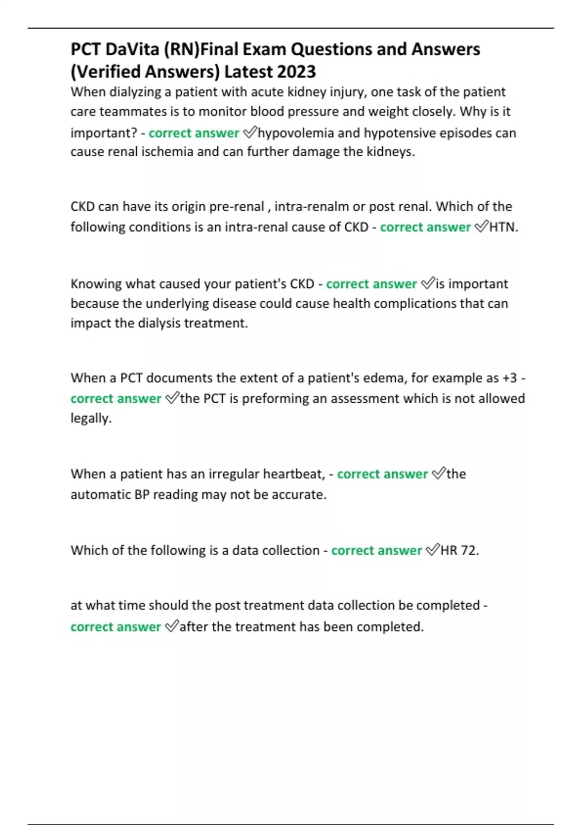 PCT DaVita RN Final Exam Questions and Answers Verified Answers Latest PCT DaVita RN Final Exam Questions and Answers Verified Answers Latest PCT DaVita RN Final Exam Questions and Answers Verified Answers Latest
