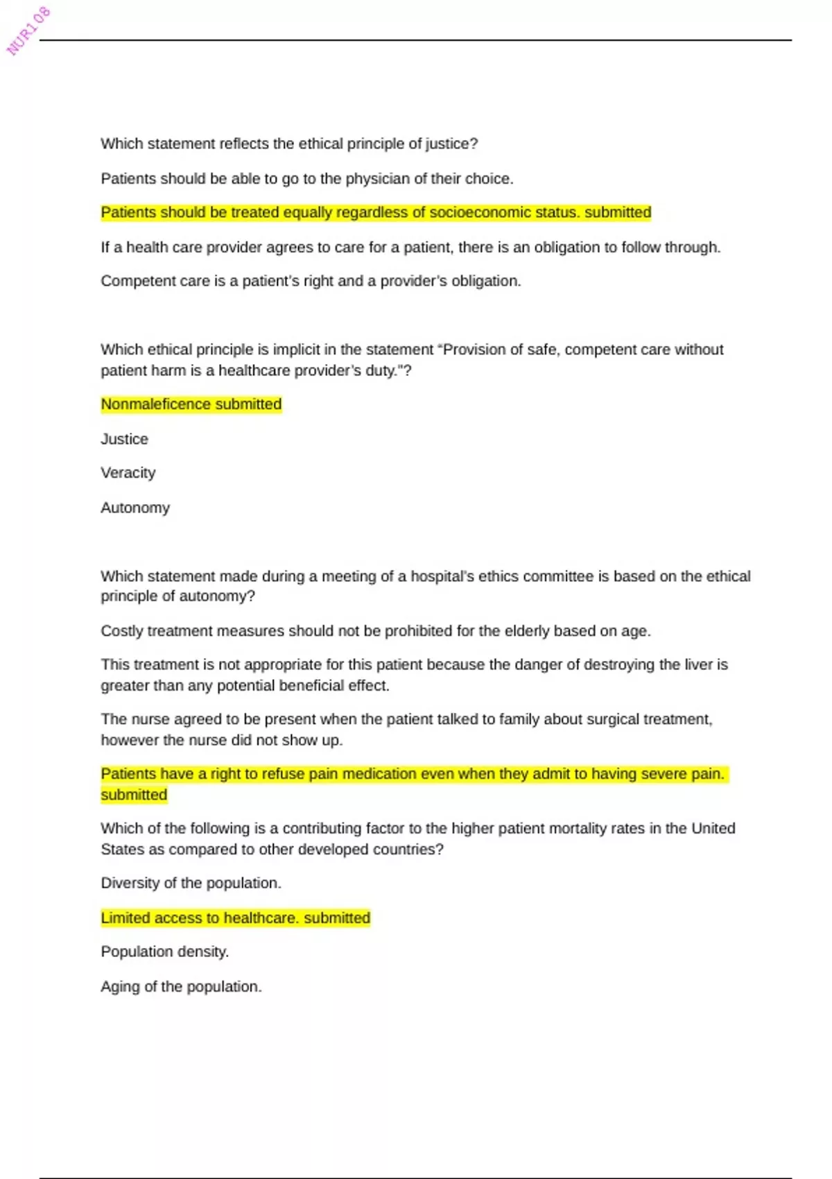 Which statement reflects the ethical principle of justice? Patients should be able to go to the physician of their choice. Patients should be treated equally regardless of socioeconomic status. submitted If a health care provider agrees to care for a patient, there is an obligation to follow through. Competent care is a patient’s right and a provider’s obligation. Which ethical principle is implicit in the statement “Provision of safe, competent care without patient harm is a healthcare provider’s duty.”? Nonmaleficence submitted Justice Veracity Autonomy