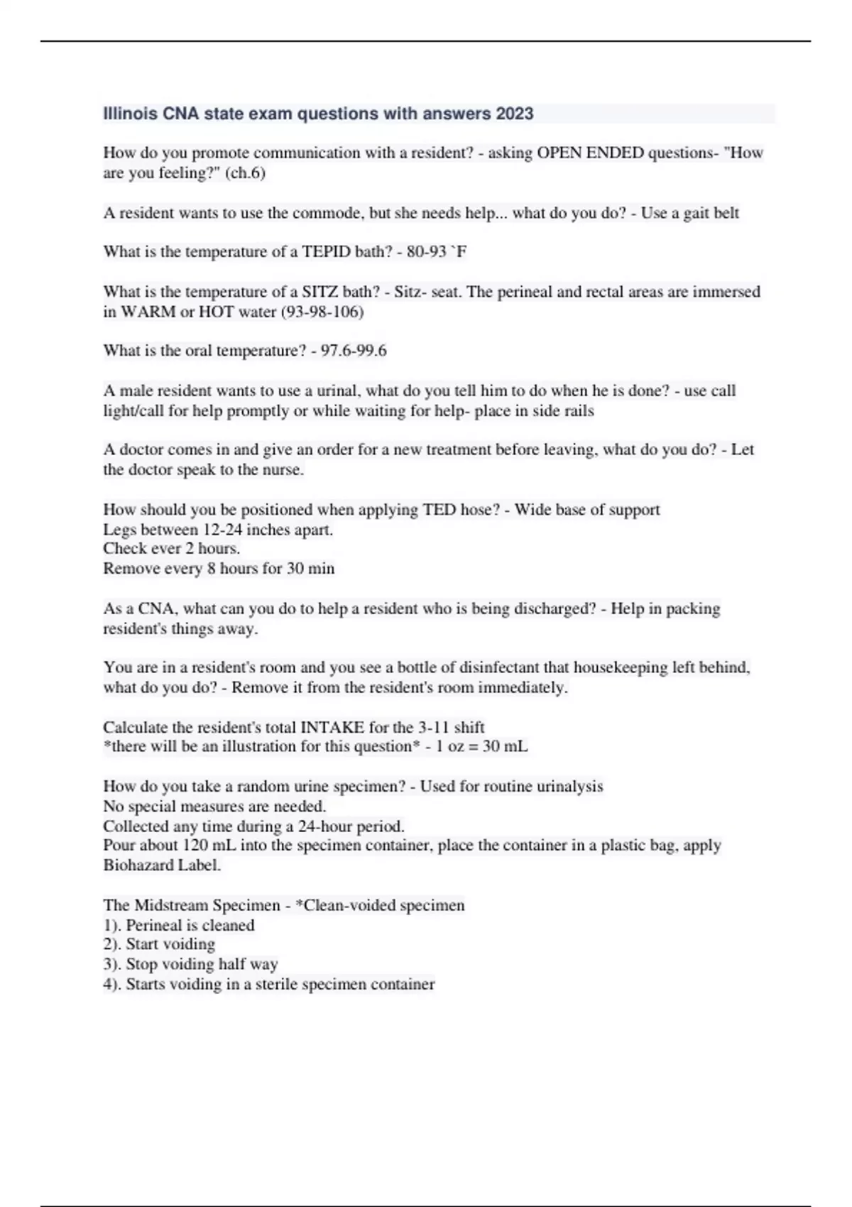 How do you promote communication with a resident? - asking OPEN ENDED questions- "How are you feeling?" (ch.6) A resident wants to use the commode, but she needs help... what do you do? - Use a gait belt What is the temperature of a TEPID bath? - 80-93 `F What is the temperature of a SITZ bath? - Sitz- seat. The perineal and rectal areas are immersed in WARM or HOT water (93-98-106) What is the oral temperature? - 97.6-99.6 A male resident wants to use a urinal, what do you tell him to do when he is done? - use call light/call for help promptly or while waiting for help- place in side rails A doctor comes in and give an order for a new treatment before leaving, what do you do? - Let the doctor speak to the nurse. How should you be positioned when applying TED hose? - Wide base of support Legs between 12-24 inches apart. Check ever 2 hours. Remove every 8 hours for 30 min As a CNA, what can you do to help a resident who is being discharged? - Help in packing resident's things away. You are in a resident's room and you see a bottle of disinfectant that housekeeping left behind, what do you do? - Remove it from the resident's room immediately. Calculate the resident's total INTAKE for the 3-11 shift *there will be an illustration for this question* - 1 oz = 30 mL How do you take a random urine specimen? - Used for routine urinalysis No special measures are needed. Collected any time during a 24-hour period. Pour about 120 mL into the specimen container, place the container in a plastic bag, apply Biohazard Label. The Midstream Specimen - *Clean-voided specimen 1). Perineal is cleaned 2). Start voiding 3). Stop voiding half way 4). Starts voiding in a sterile specimen container