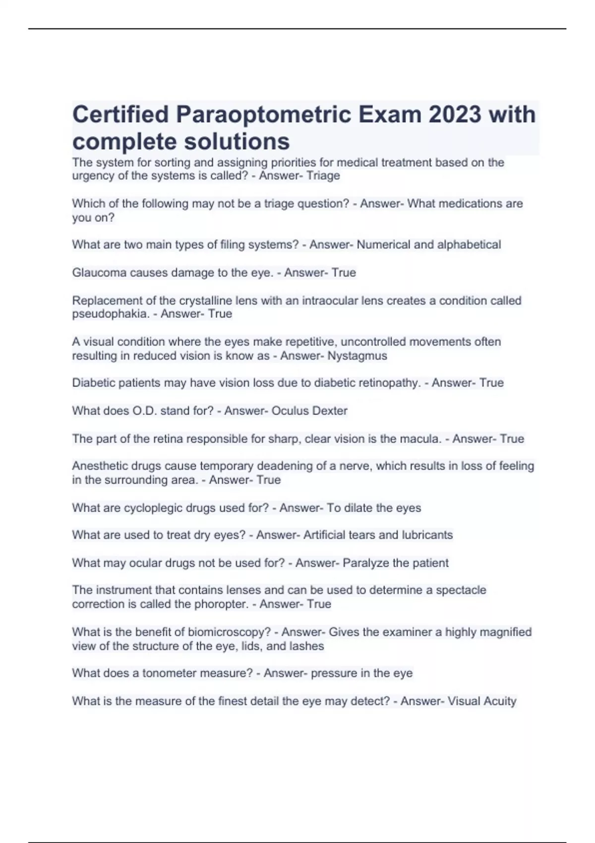 Certified Paraoptometric Exam 2023 with complete solutions