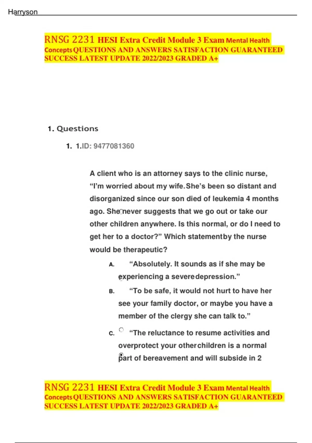 Hesi extra credit module 3 exam docxRNSG 2231 HESI Extra Credit Module 3 Exam Mental Health ConceptsQUESTIONS AND ANSWERS SATISFACTION GUARANTEED SUCCESS LATEST UPDATE 2022/2023 GRADED A+ RNSG 2231 HESI Extra Credit Module 3 Exam Mental Health ConceptsQUESTIONS AND ANSWERS SATISFACTION GUARANTEED SUCCESS LATEST UPDATE 2022/2023 GRADED A+ 1. Questions 1. 1.ID: 0 A client who is an attorney says to the clinic nurse, “I’m worried about my wife.She’s been so distant and disorganized since our son died of leukemia 4 months ago. She never suggests that we go out or take our other children anywhere. Is this normal, or do I need to get her to a doctor?” Which statementby the nurse would be therapeutic? A. “Absolutely. It sounds as if she may be experiencing a severedepression.” B. “To be safe, it would not hurt to have her see your family doctor, or maybe you have a member of the clergy she can talk to.” C. “The reluctance to resume activities and overprotect your otherchildren is a normal part of bereavement and will subside in 2 Harryson RNSG 2231 HESI Extra Credit Module 3 Exam Mental Health ConceptsQUESTIONS AND ANSWERS SATISFACTION GUARANTEED SUCCESS LATEST UPDATE 2022/2023 GRADED A+ RNSG 2231 HESI Extra Credit Module 3 Exam Mental Health ConceptsQUESTIONS AND ANSWERS SATISFACTION GUARANTEED SUCCESS LATEST UPDATE 2022/2023 GRADED A+ months.” D. “It’s normal, but by the end of a year you can expect that yourwife is improving and able to redirect her energy. Have you expressed your concerns to her?” Correct Rationale: The nurse should provide the husband with correct information and let him know that disorganization and a depressive mood usually ease over thecourse of a year’s bereavement and that loneliness and aimlessness usually peak 6 to 9 months after a death. In stating, “Absolutely. It sounds as if she may be experiencing a severe depression,” the nurse overreacts and offers a pseudodiagnosis. This is nontherapeutic and unprofessional. In stating, “To besafe, it would not hurt to have her see your family doctor, or maybe you have amember of the clergy she can talk to,” the nurse offers a good source of support as a referral, which may be helpful, but it is incorrect to allow the spouse to be concerned. Stating, “The reluctance to resume activities and overprotect your other children is a normal part of bereavement and will subside in 2 months” is a partly correct