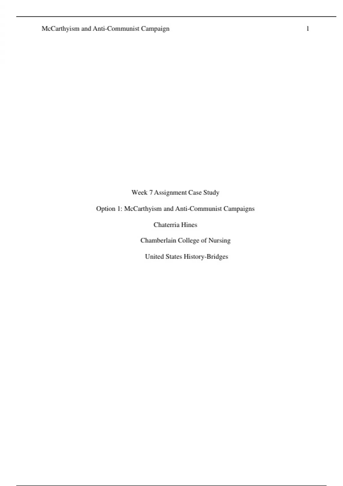 HIST 405N Week 7 Case Study: McCarthyism and Anti-Communist Campaigns (Option 1)
