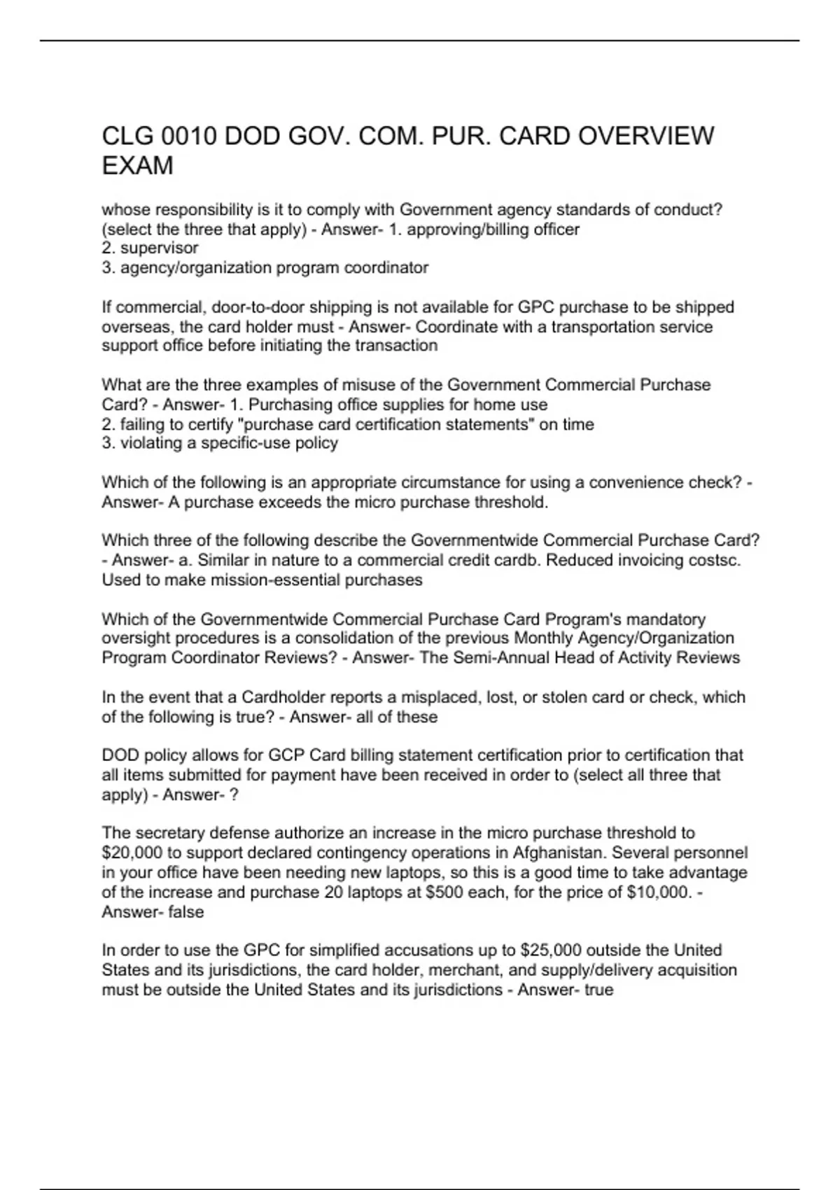 CLG 0010 DOD GOV. COM. PUR. CARD OVERVIEW EXAM