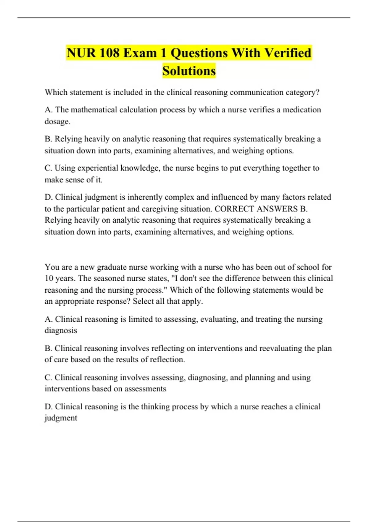 NUR 108 Exam 1 Questions With Verified Solutions