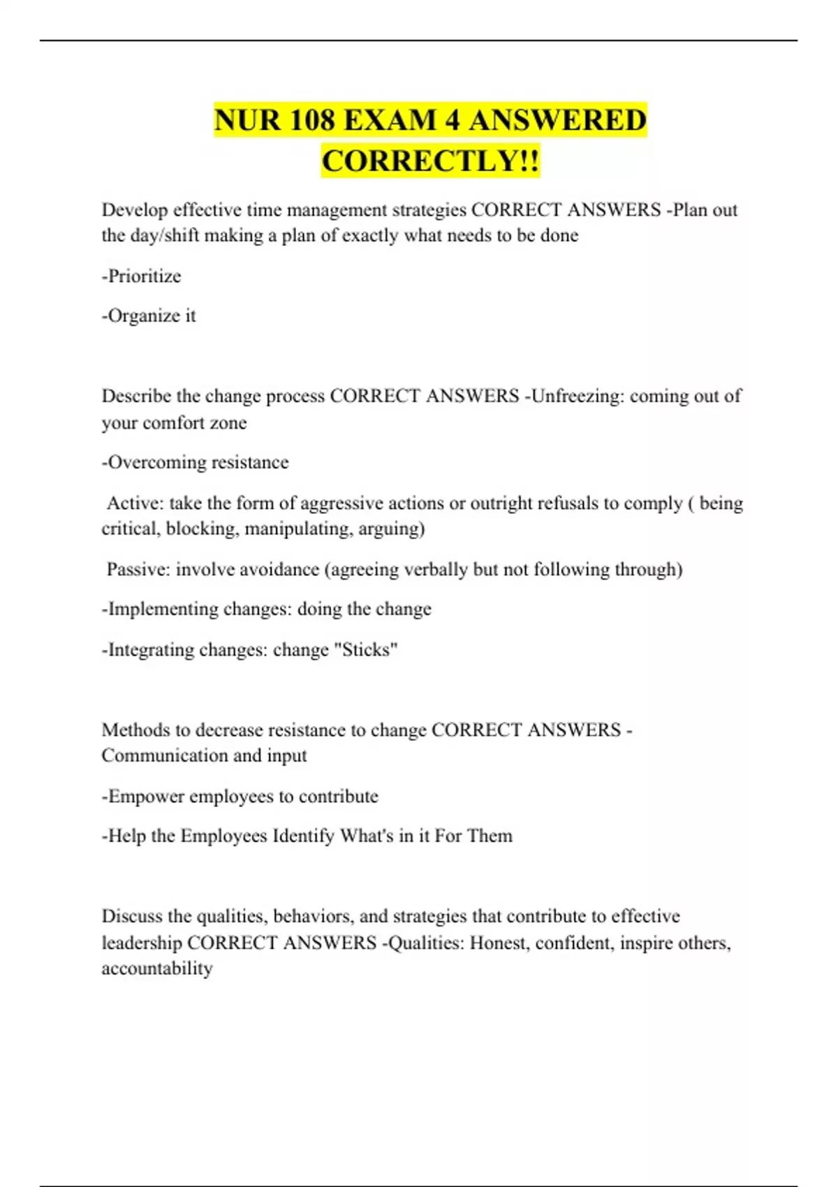NUR 108 EXAM 4 ANSWERED CORRECTLY!!