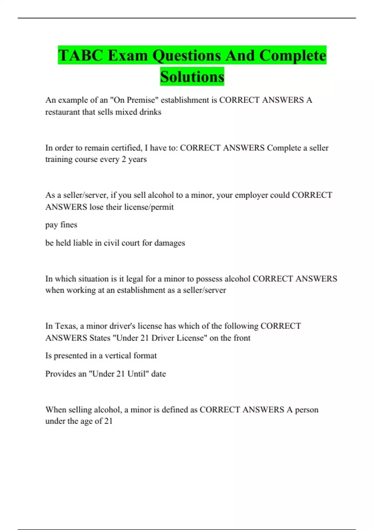 TABC Exam Questions And Complete Solutions