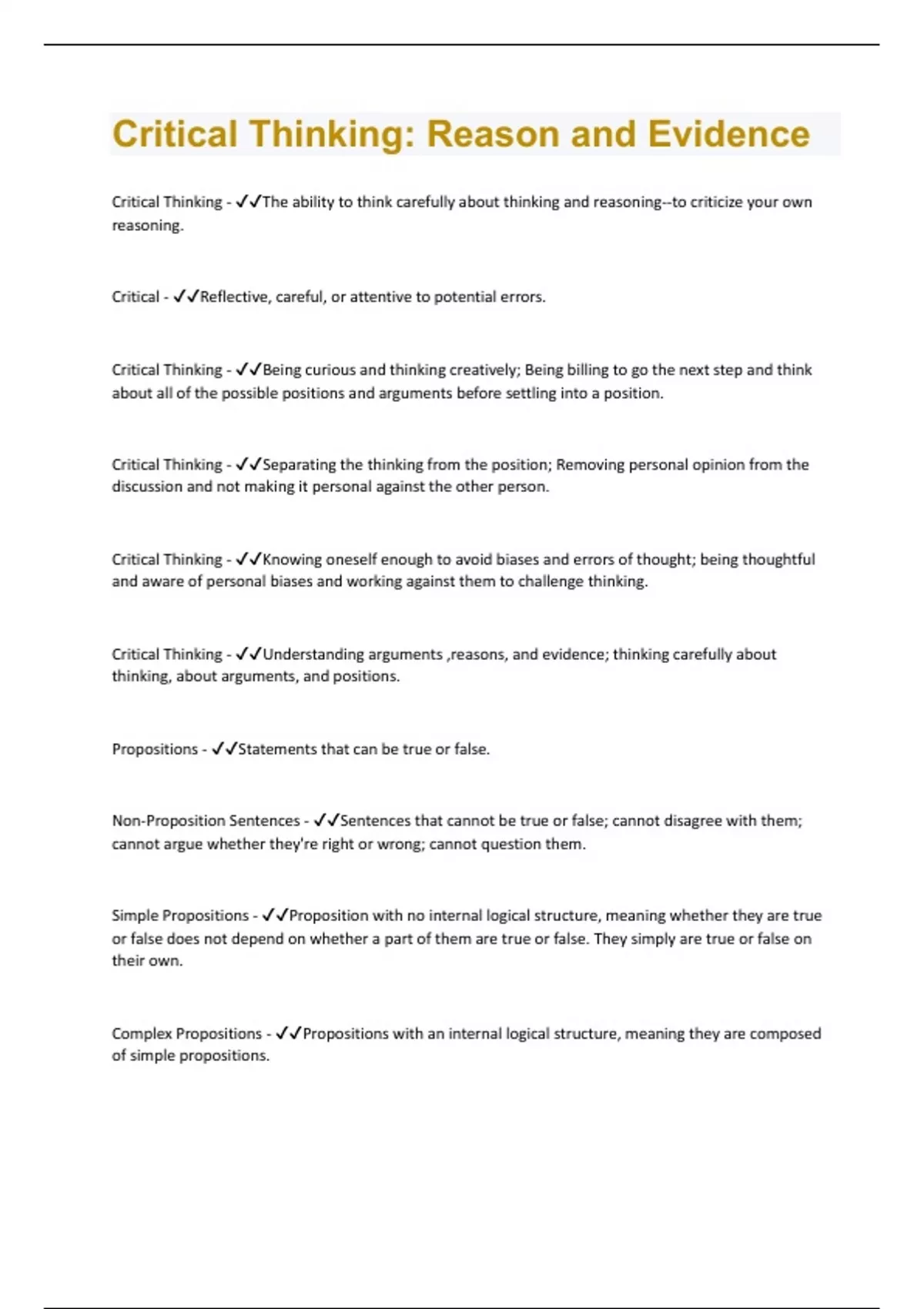 Critical Thinking - The ability to think carefully about thinking and reasoning--to criticize your own reasoning. Critical - Reflective, careful, or attentive to potential errors. Critical Thinking - Being curious and thinking creatively; Being billing to go the next step and think about all of the possible positions and arguments before settling into a position. Critical Thinking - Separating the thinking from the position; Removing personal opinion from the discussion and not making it personal against the other person. Critical Thinking - Knowing oneself enough to avoid biases and errors of thought; being thoughtful and aware of personal biases and working against them to challenge thinking. Critical Thinking - Understanding arguments ,reasons, and evidence; thinking carefully about thinking, about arguments, and positions. Propositions - Statements that can be true or false. Non-Proposition Sentences - Sentences that cannot be true or false; cannot disagree with them; cannot argue whether they're right or wrong; cannot question them. Simple Propositions - Proposition with no internal logical structure, meaning whether they are true or false does not depend on whether a part of them are true or false. They simply are true or false on their own. Complex Propositions - Propositions with an internal logical structure, meaning they are composed of simple propositions.Common Anatomy of an Argument - One or more premises that are propositions that support or demonstrate at least one conclusion.