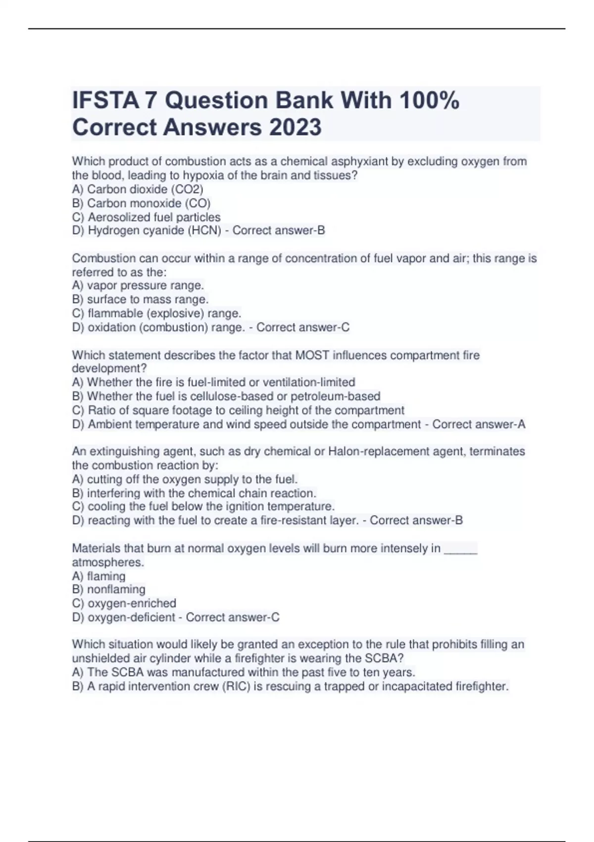 IFSTA 7 Question Bank With 100% Correct Answers 2023 IFSTA 7 Exam Question Bank, With Complete Solutions, A+ Guide-Which product of combustion acts as a chemical asphyxiant by excluding oxygen from the blood, leading to hypoxia of the brain and tissues? A) Carbon dioxide (CO2) B) Carbon monoxide (CO) C) Aerosolized fuel particles D) Hydrogen cyanide (HCN) - B Combustion can occur within a range of concentration of fuel vapor and air; this range is referred to as the: A) vapor pressure range. B) surface to mass range. C) flammable (explosive) range. D) oxidation (combustion) range. - C Which statement describes the factor that MOST influences compartment fire development? A) Whether the fire is fuel-limited or ventilation-limited B) Whether the fuel is cellulose-based or petroleum-based C) Ratio of square footage to ceiling height of the compartment D) Ambient temperature and wind speed outside the compartment - A An extinguishing agent, such as dry chemical or Halon-replacement agent, terminates the combustion reaction by: A) cutting off the oxygen supply to the fuel. B) interfering with the chemical chain reaction. C) cooling the fuel below the ignition temperature. D) reacting with the fuel to create a fire-resistant layer. - B Materials that burn at normal oxygen levels will burn more intensely in _____ atmospheres. A) flaming B) nonflaming C) oxygen-enriched D) oxygen-deficient - C Which situation would likely be granted an exception to the rule that prohibits filling an unshielded air cylinder while a firefighter is wearing the SCBA? A) The SCBA was manufactured within the past five to ten years. B) A rapid intervention crew (RIC) is rescuing a trapped or incapacitated firefighter. C) The firefighter filling the empty cylinder is wearing full structural personal protective equipment. D) A firefighter with a higher rank than the firefighter wearing the SCBA cylinder is available to perform the refill. - B What is a general safety precaution to take when refilling an SCBA cylinder? A) Wear full structural fire fighting PPE. B) Fill the cylinder as quickly as possible. C) Perform a hydrostatic test on the cylinder. D) Check the hydrostatic test date of the cylinder. - D Which piece of information must be included on the permanent compliance label inside each piece of PPE? A) Firefighter's name
