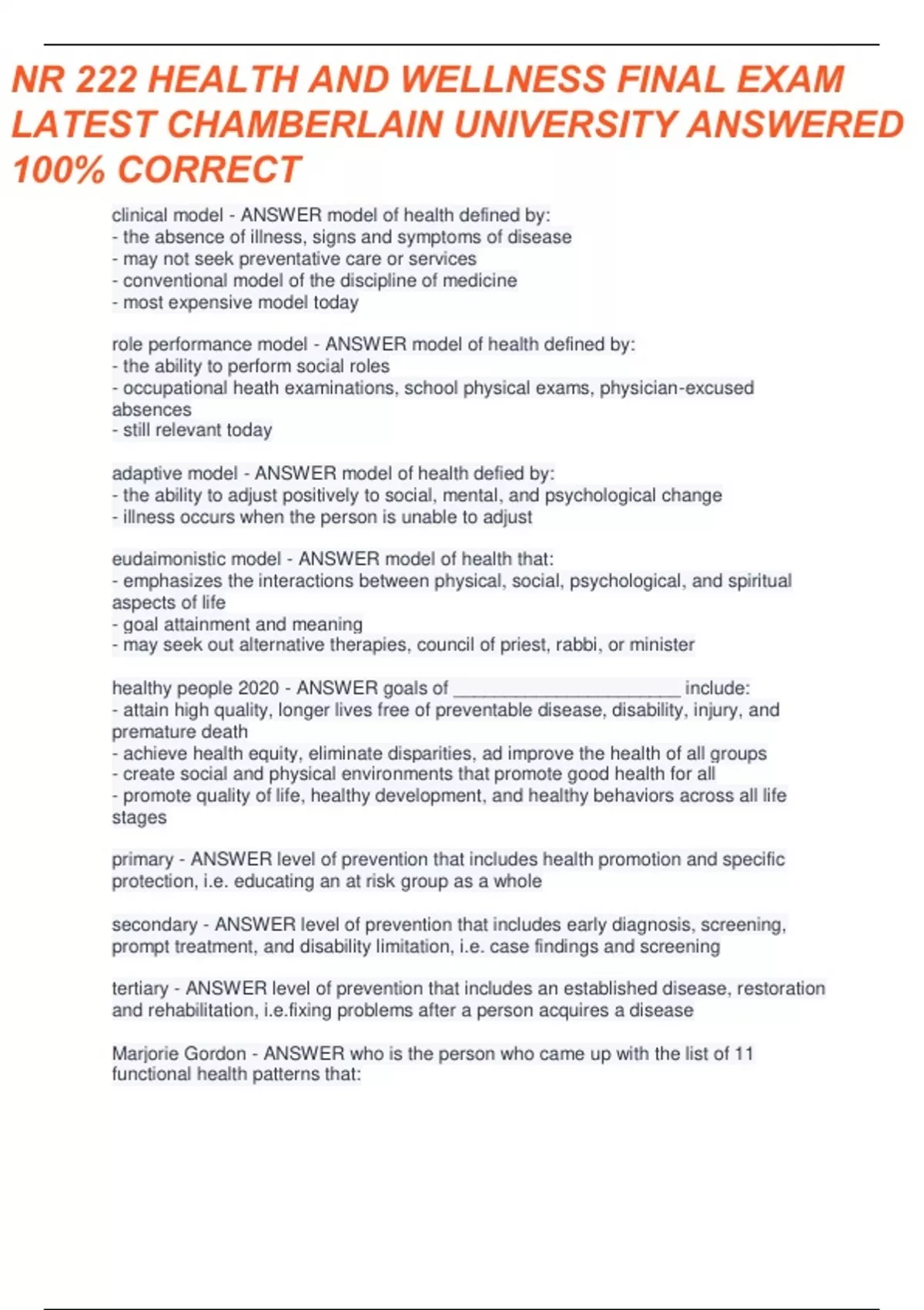 NR 222 HEALTH AND WELLNESS FINAL EXAM LATEST CHAMBERLAIN UNIVERSITY ANSWERED 100% CORRECT