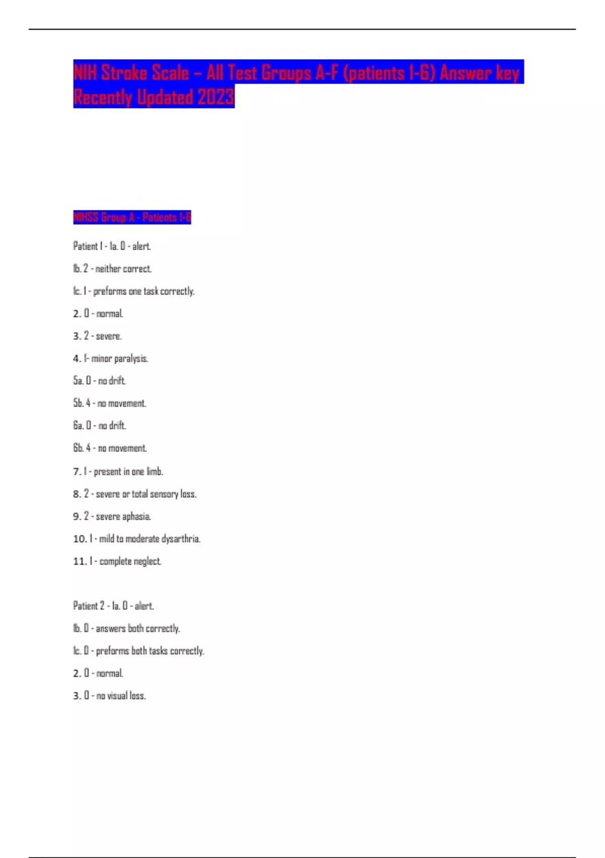 NIH Stroke Scale – All Test Groups A-F (patients 1-6) Answer key Recently Updated 2023